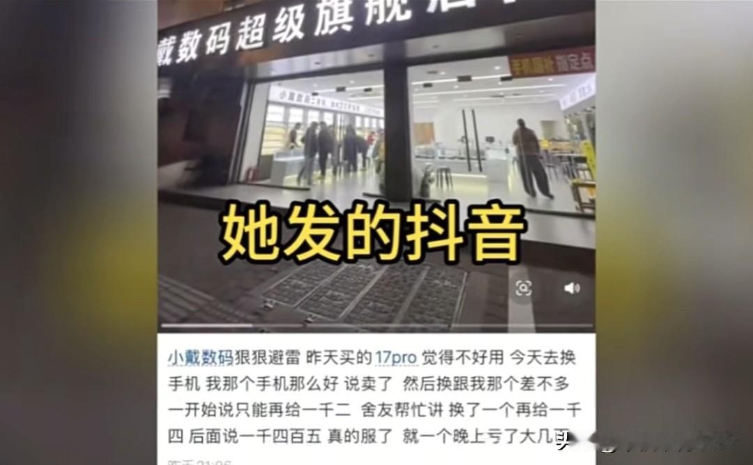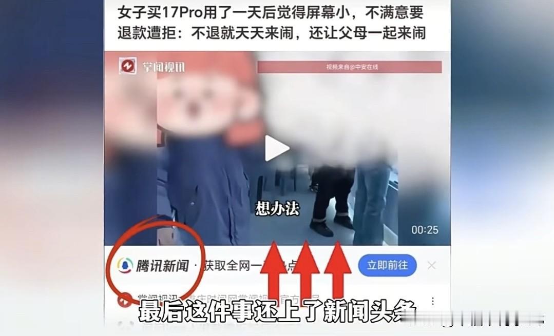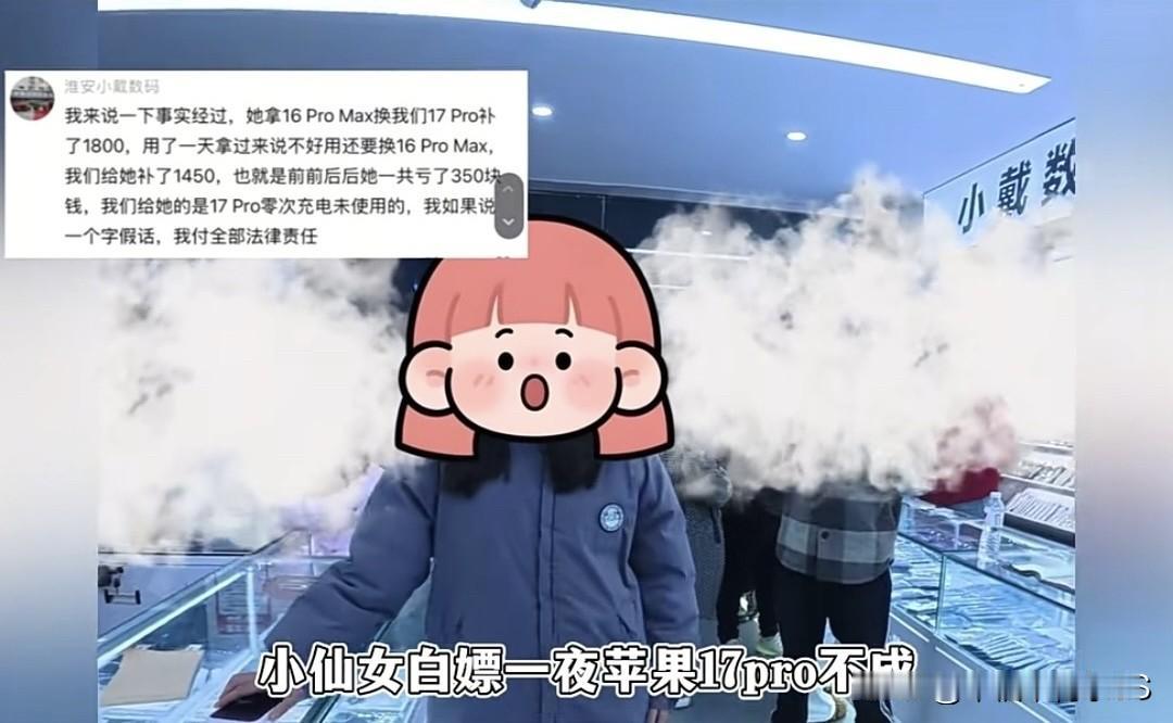 小仙女白嫖苹果17Pro一夜,被扣350元折损费后带全家大闹手机店 小仙女眼馋新出的苹果17Pro,拿着自己的苹果16加1800块,在手机店置换了一台全新未充电的苹果17Pro。结果第二天就找老板退款理由是“手机屏幕太小”,要求把1800块和苹果16全退回来。 老板当然不同意,毕竟为了这单生意,帮忙传文件忙活了好几个小时,而且全新手机只要用了就有折损费。这小妹直接赖在店里不走,老板没办法,扣了她350块折损费后给她退了机。 本以为这事就完了,结果这小妹拿了钱出门就翻脸,还拍了门店照片全网发,过几天甚至带着弟弟上门闹事,把警察都叫来了,最后这事还上了新闻头条。 她丝毫不觉得自己有错,还威胁老板说自己身体不好,再闹的话说不定就直接晕在店里。这白嫖操作加无理取闹,真是把人看傻了!