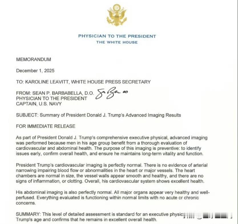 【黄金时代】川普高级影像检查结果摘要 作为唐纳德·J·特朗普总统全面行政体检的一部分,进行了高级影像检查,因为像他这个年龄段的男性可以从对心血管和腹部健康的全面评估中受益。此次影像检查的目的是预防:及早发现问题,确认整体健康状况,并确保他保持长期的活力和功能 特朗普总统的心血管影像检查结果完全正常。没有证据表明动脉狭窄会损害血液流动,也没有心脏或主要血管的异常。心腔大小正常,血管壁光滑健康,没有炎症或血栓的迹象。总体而言,他的心血管系统健康状况极佳。 他的腹部影像检查结果也完全正常。所有主要器官看起来都非常健康且灌注良好。所有评估项目的功能均在正常范围内,没有急性或慢性问题。 总结:这种详细程度的评估对于特朗普总统这个年龄段的行政体检来说是标准的,并证实他仍然保持着极佳的整体健康状况