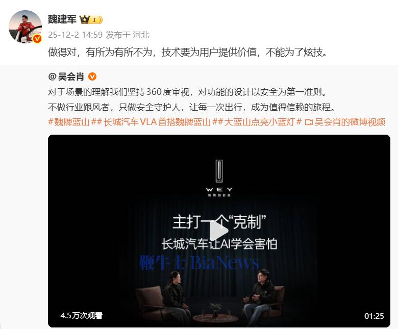 长城汽车董事长魏建军转发博文并表示:“做得对,有所为有所不为,技术要为用户提供价值,不能为了炫技。”