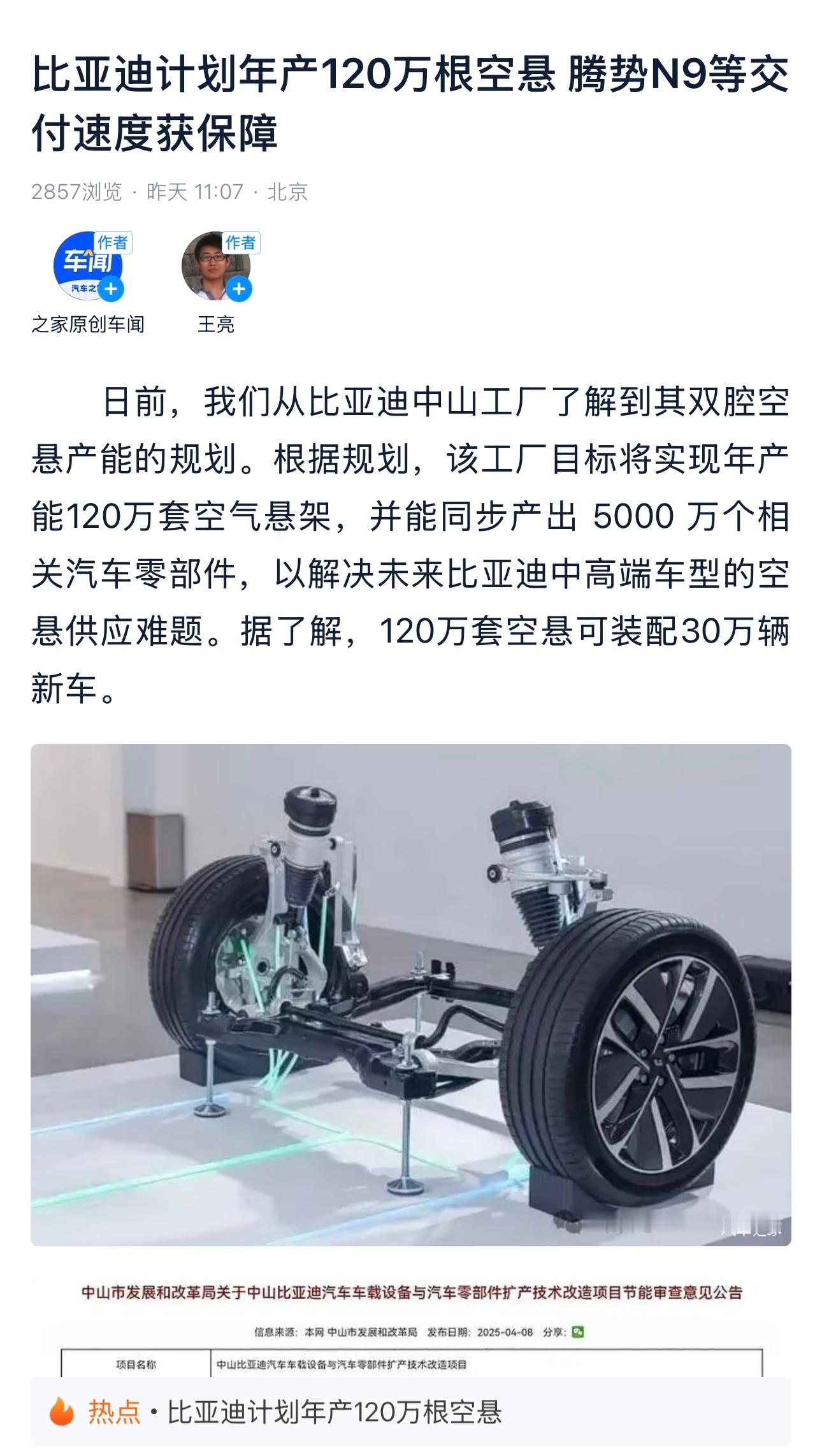 看之家报道的,比亚迪双腔空悬产能达到120万套空气悬架,可适配30万辆新车。这么
