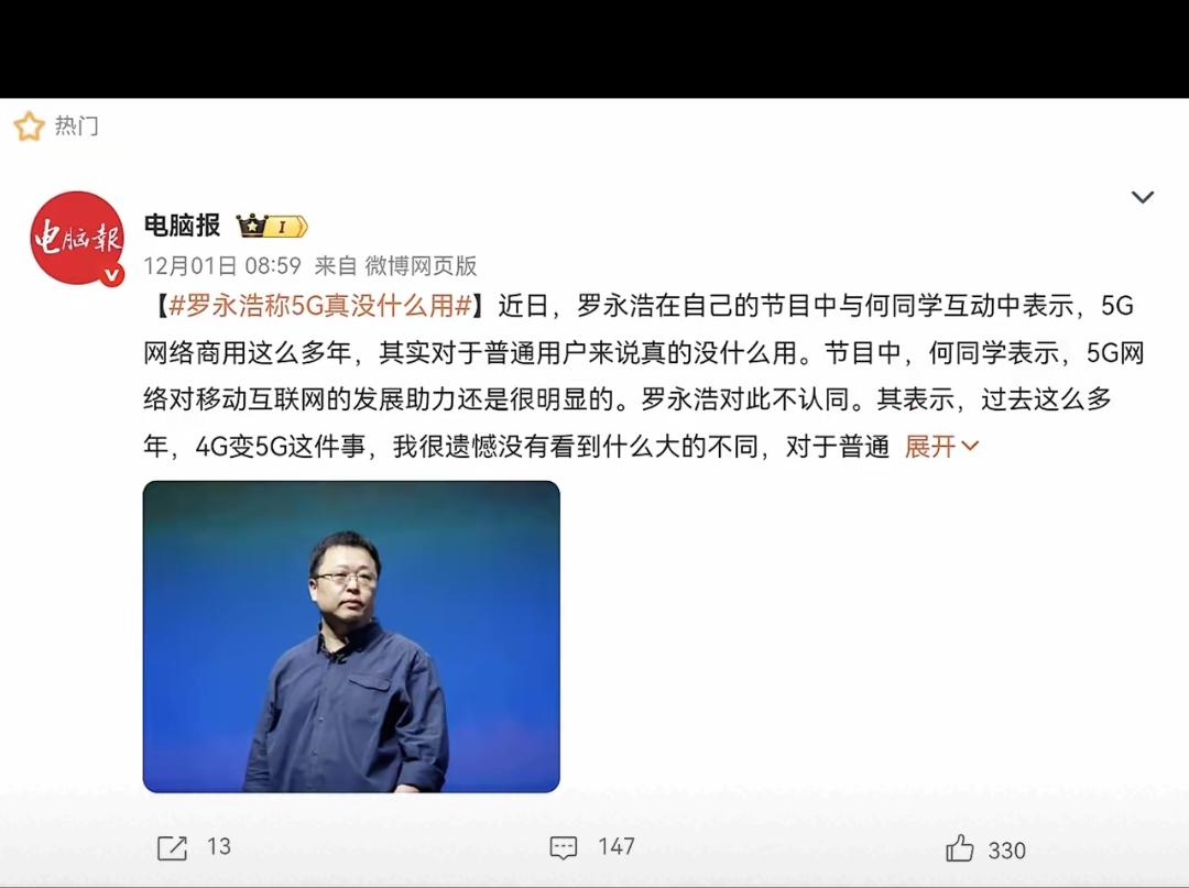 罗永浩吐槽5G没用?怕是忘了自己8亿还债路全靠5G铺路! 他能靠直播逆风翻盘,根本离不开5G的技术兜底。4G时代直播卡顿成常态,首屏加载要两三秒,高并发时还老断联,连王思聪都栽过跟头。换成5G后,延迟直接降60%,超高清画面不卡壳,这才让直播带货成了全民消费场景。 说白了,他不是不懂5G的好,是没看清技术红利的底层逻辑。 5G从不是单纯的“网速快”,而是撑起直播互动、超高清传输的基建,没有这层支撑,他的“真还传”恐怕难成气候。 享受着技术带来的红利,却否定技术的价值,这格局是不是小了点? 你觉得5G还有哪些被低估的作用?来聊聊!