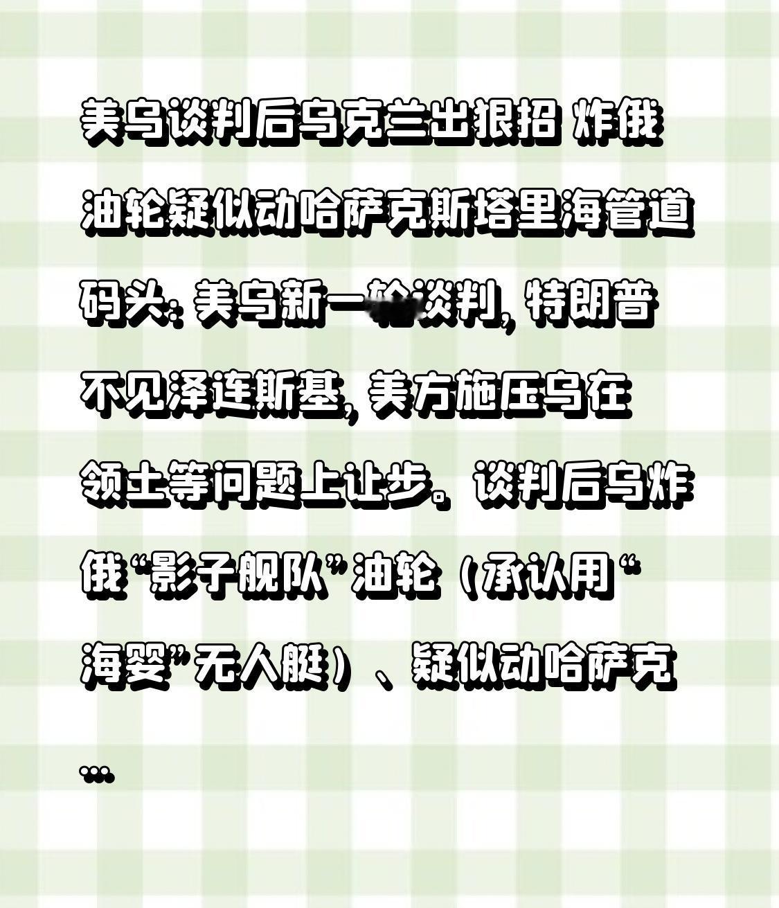 美乌谈判后乌克兰出狠招 炸俄油轮疑似动哈萨克斯塔里海管道码头:美乌新一轮谈判,特朗普不见泽连斯基,美方施压乌在领土等问题上让步。谈判后乌炸俄“影子舰队”油轮(承认用“海婴”无人艇)、疑似动哈萨克斯塔里海管道码头,想拿谈判筹码、证明不被拿捏,实因被逼绝境(需美援助、国内问题)。