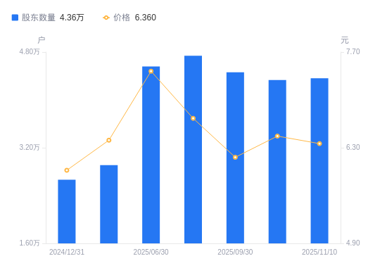 日期A股户数(户)流通A股户均持股数(股)户均持股市值(万元)2025-11-104360822704.0914.442025-10-204332422852.9314.792025-09-304462122188.6613.672025-08-294738920892.6214.062025-06-304560221711.3316.112025-03-312910034023.2821.812024-12-312665137149.7322.182024-09-302039328471.7821.202024-06-302263325653.9213.062024-03-312387524319.0419.96