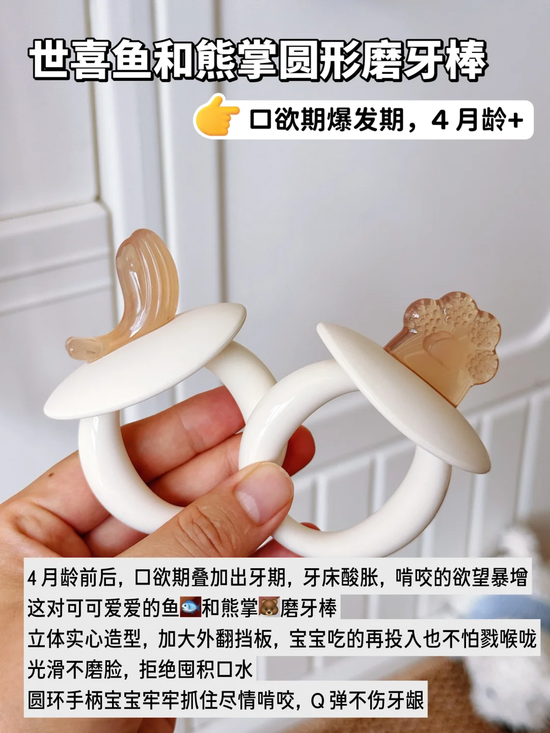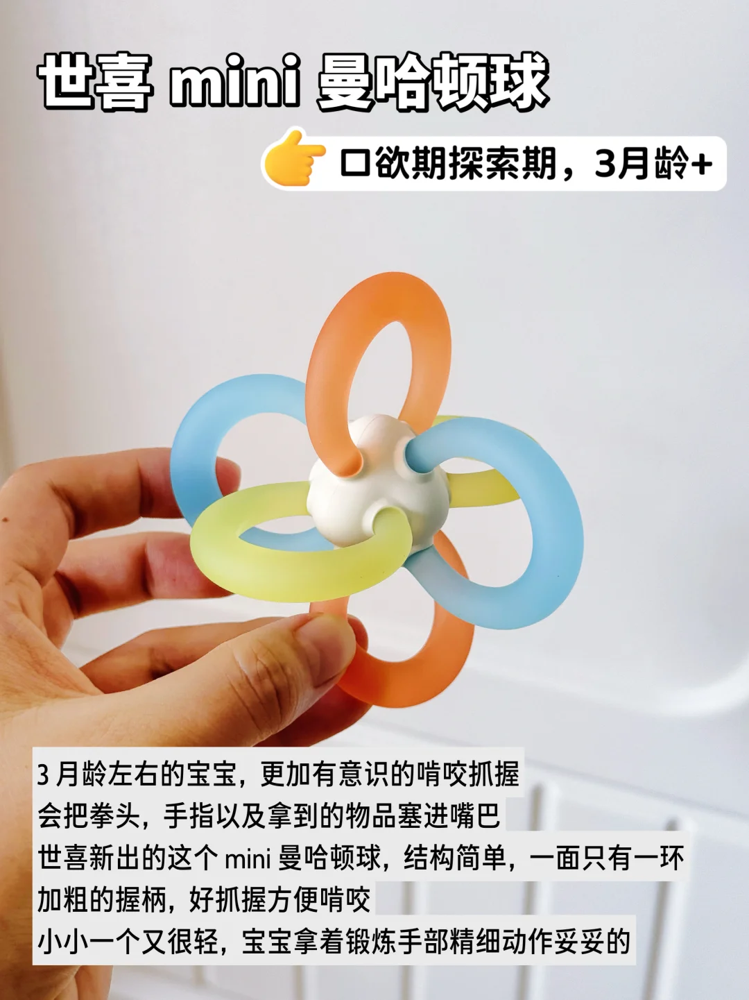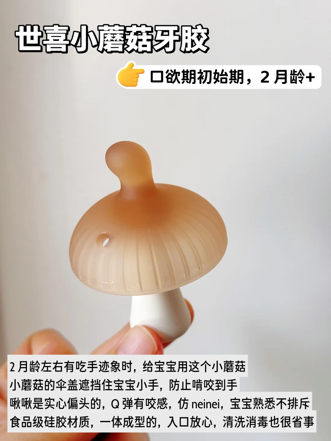 妈妈们应该都经历过,大多数宝宝婴儿时期都会吃手,早则月子里,晚则3、4月龄时都会有这个行为。那么,宝宝吃手到底要不要阻止呢? · 读了不少育儿书,小婴儿吃手是本能反应,大部分宝宝在2-3月龄时,发现自己有手就开始吃,通过手和口来探索感知世界。等到了宝宝1岁以后,活动范围增加、认知能力提升,有更多吸引她的事物,就会逐渐停止吃手。所以,作为新手爸妈,看到宝宝吃手也不要过于焦虑和紧张,过度干涉宝宝吃手! 但是,有些小宝宝持续沉迷只吃一根手指,有些是大拇指、有些食指,吃到皮肤红肿,甚至小手破皮起老茧。这就需要爸爸妈妈正确介入引导了。 毫不夸张,我家妹妹月子里就会吧唧吃手了,手指逐个在嘴里嗦。本着吃手是本能的原则,我们只是给她洗干净手脸,勤剪指甲让她吃。 但是到后面越来越严重,无聊时吃、吃奶时吃、睡觉时吃,手指都吸破红肿了。连夜和老公一起做功课,入手了一堆牙胶,最后发现宝宝喜欢吃的还是这几个! · 🍄 世喜小蘑菇牙胶 2月龄前后宝宝进入口欲期,开始吃手时就给她安排上,小蘑菇伞盖遮住小手,防止宝宝吃到手,实心仿neinei的咬头,QQ弹弹,宝宝更有熟悉感,乐于接受! ⚽️ 世喜mini曼哈顿球 3月龄左右宝宝对手的认知更进一步,学习用手去探索周围的一切,吃手更熟练。这个新出的mini曼哈顿球,小小一个更轻盈,每个面只有一个环,方便宝宝抓握啃咬,也有助于锻炼手部精细动作和手眼协调。 🐟 世喜鱼和熊掌磨牙棒 4月龄前后大多数宝宝开始出牙了,牙床酸胀痒,啃咬的需求更旺盛。这对磨牙棒真的是帮了大忙! 🐻熊掌款圆饼型布满硅胶凸点,贴合前牙床,按摩刺激前牙萌出;🐟小鱼款侧弧形分布线型纹理,深入后牙床,后牙也能轻松按摩到 加大外翻挡板+加粗圆形把手,宝宝牢牢抓握住,吃的再投入也不卡戳到喉咙! 三款牙胶都是食品级液态硅胶材质,和世喜家的奶嘴同款材质,入口也很安心。一体式无缝设计,没有卫生死角,用完直接在水龙头下冲洗,高温消毒也很省事!