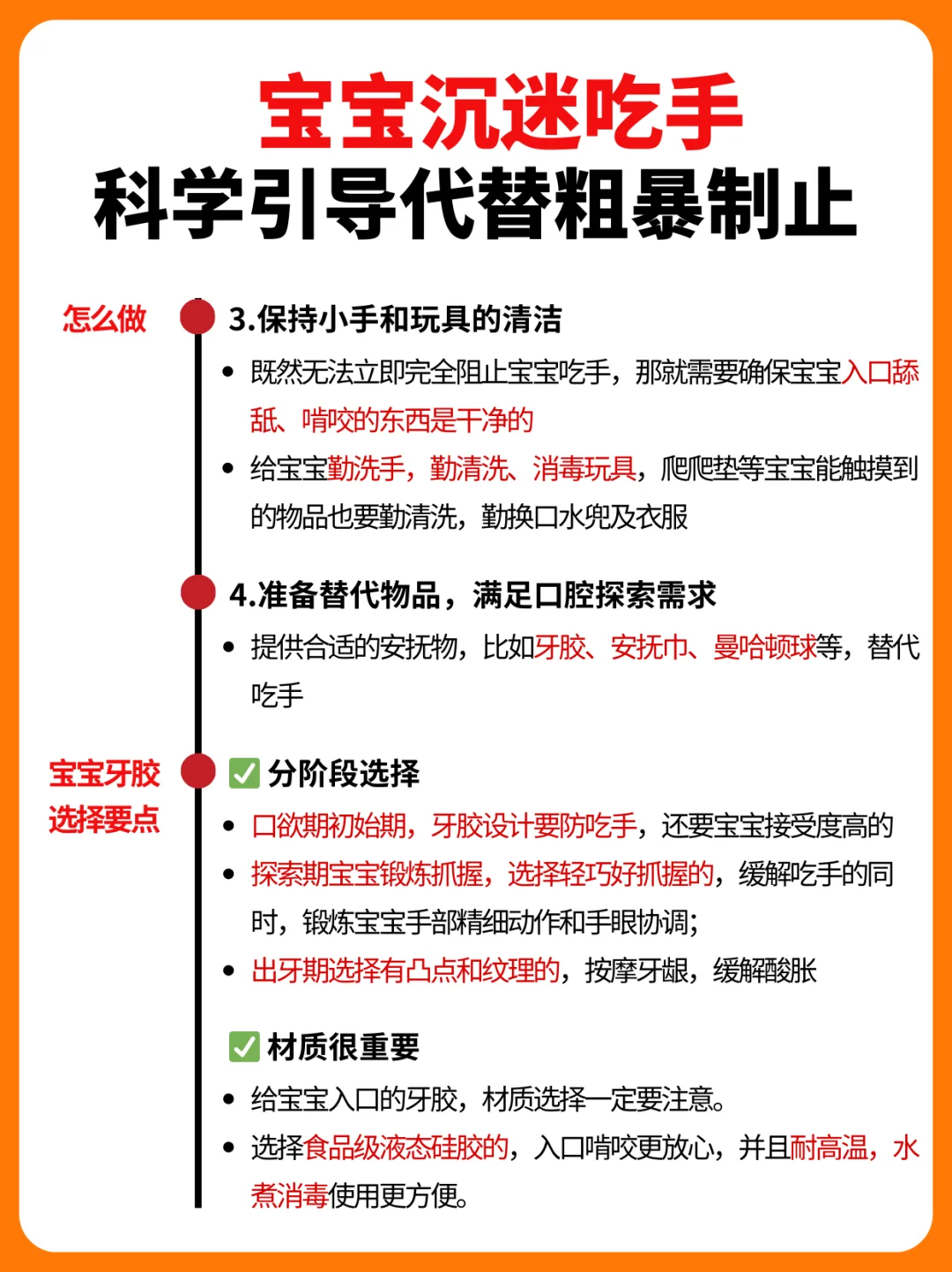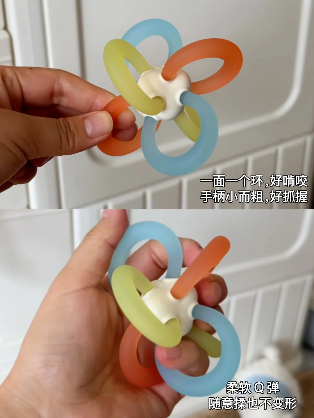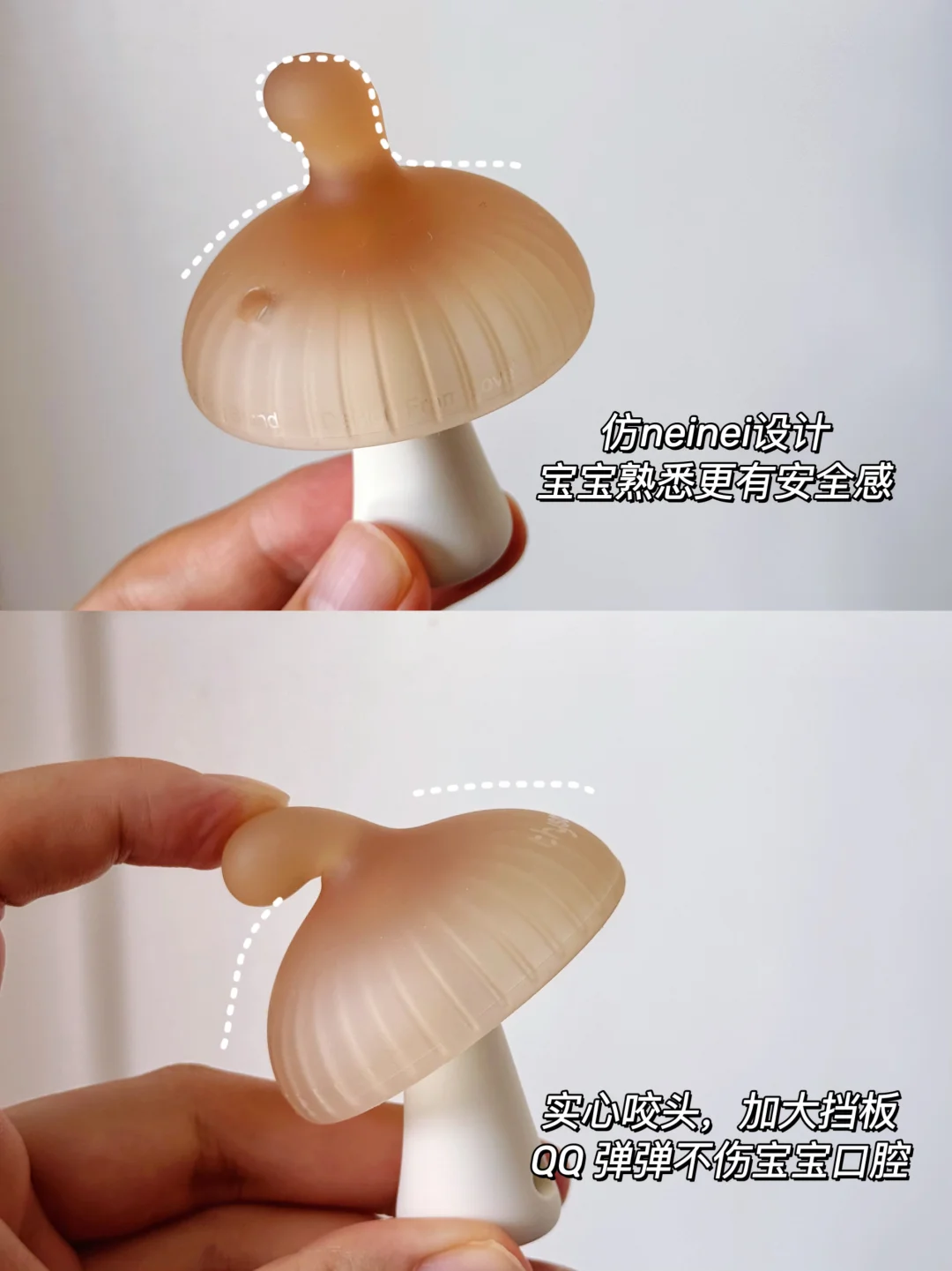 妈妈们应该都经历过,大多数宝宝婴儿时期都会吃手,早则月子里,晚则3、4月龄时都会有这个行为。那么,宝宝吃手到底要不要阻止呢? · 读了不少育儿书,小婴儿吃手是本能反应,大部分宝宝在2-3月龄时,发现自己有手就开始吃,通过手和口来探索感知世界。等到了宝宝1岁以后,活动范围增加、认知能力提升,有更多吸引她的事物,就会逐渐停止吃手。所以,作为新手爸妈,看到宝宝吃手也不要过于焦虑和紧张,过度干涉宝宝吃手! 但是,有些小宝宝持续沉迷只吃一根手指,有些是大拇指、有些食指,吃到皮肤红肿,甚至小手破皮起老茧。这就需要爸爸妈妈正确介入引导了。 毫不夸张,我家妹妹月子里就会吧唧吃手了,手指逐个在嘴里嗦。本着吃手是本能的原则,我们只是给她洗干净手脸,勤剪指甲让她吃。 但是到后面越来越严重,无聊时吃、吃奶时吃、睡觉时吃,手指都吸破红肿了。连夜和老公一起做功课,入手了一堆牙胶,最后发现宝宝喜欢吃的还是这几个! · 🍄 世喜小蘑菇牙胶 2月龄前后宝宝进入口欲期,开始吃手时就给她安排上,小蘑菇伞盖遮住小手,防止宝宝吃到手,实心仿neinei的咬头,QQ弹弹,宝宝更有熟悉感,乐于接受! ⚽️ 世喜mini曼哈顿球 3月龄左右宝宝对手的认知更进一步,学习用手去探索周围的一切,吃手更熟练。这个新出的mini曼哈顿球,小小一个更轻盈,每个面只有一个环,方便宝宝抓握啃咬,也有助于锻炼手部精细动作和手眼协调。 🐟 世喜鱼和熊掌磨牙棒 4月龄前后大多数宝宝开始出牙了,牙床酸胀痒,啃咬的需求更旺盛。这对磨牙棒真的是帮了大忙! 🐻熊掌款圆饼型布满硅胶凸点,贴合前牙床,按摩刺激前牙萌出;🐟小鱼款侧弧形分布线型纹理,深入后牙床,后牙也能轻松按摩到 加大外翻挡板+加粗圆形把手,宝宝牢牢抓握住,吃的再投入也不卡戳到喉咙! 三款牙胶都是食品级液态硅胶材质,和世喜家的奶嘴同款材质,入口也很安心。一体式无缝设计,没有卫生死角,用完直接在水龙头下冲洗,高温消毒也很省事!