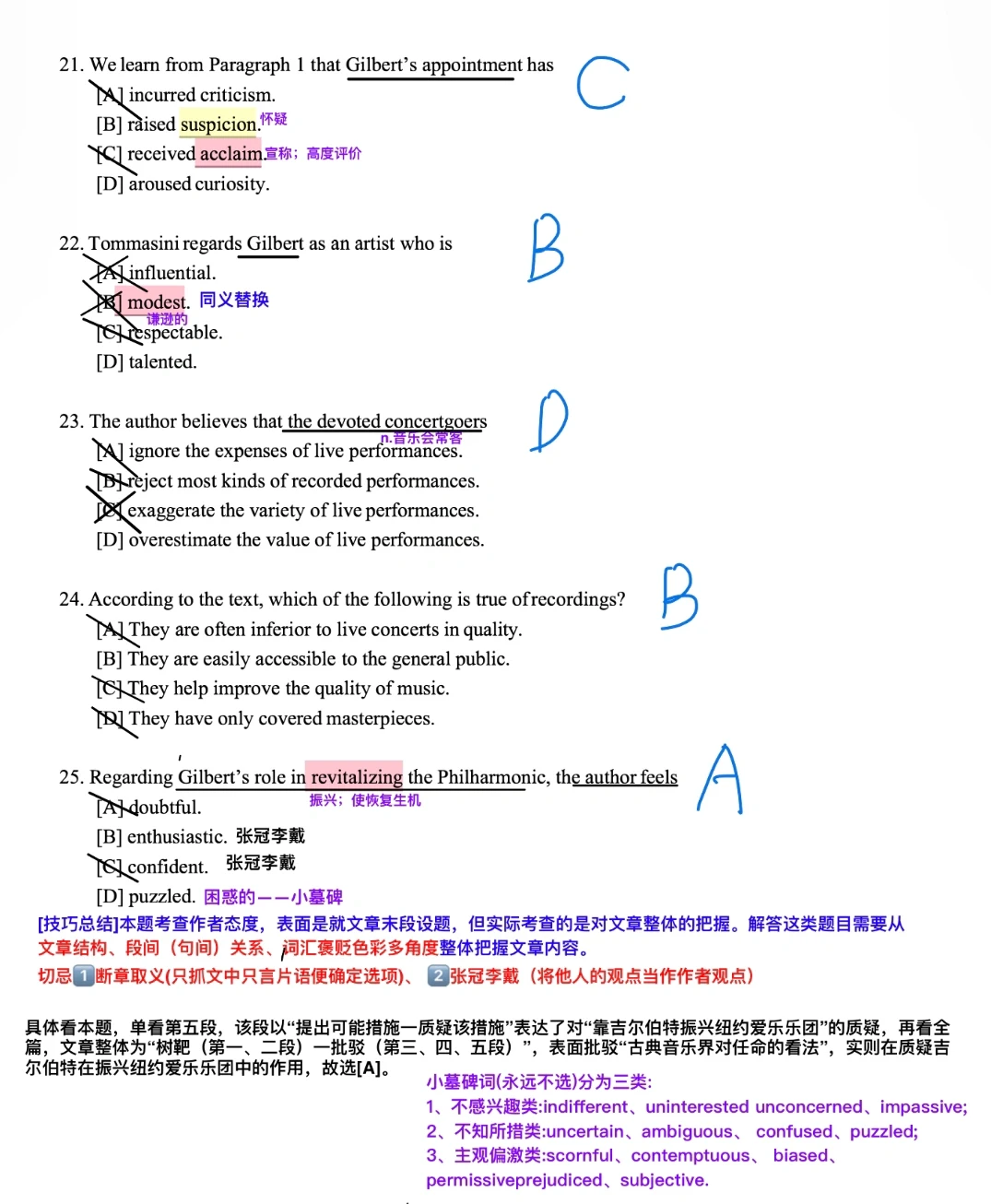 题干中attitude、seem、tone deem、consider以及选项中能表达正面、负面或中性色彩的形容词名词。