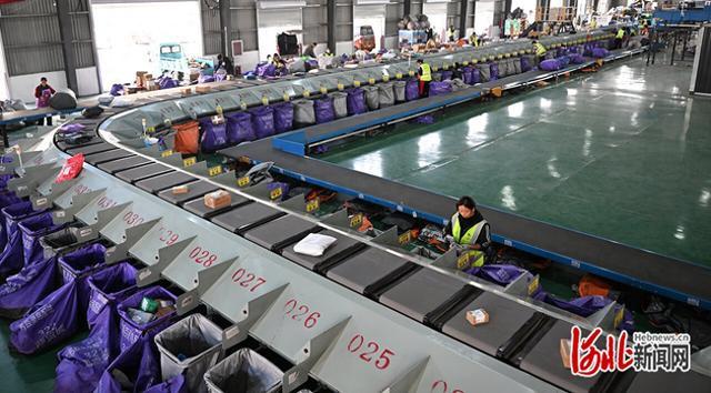 近日,在大名县“一品一播”产业园快递物流配送仓,工人在智能化分拣线上工作。河北日报记者赵永辉摄