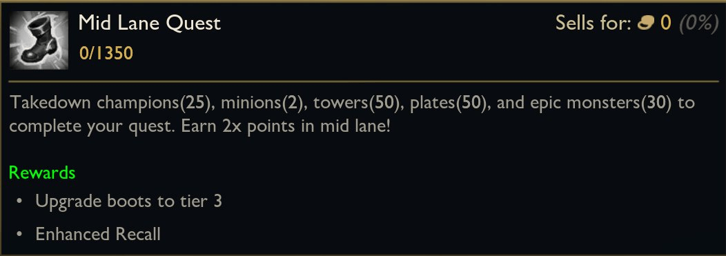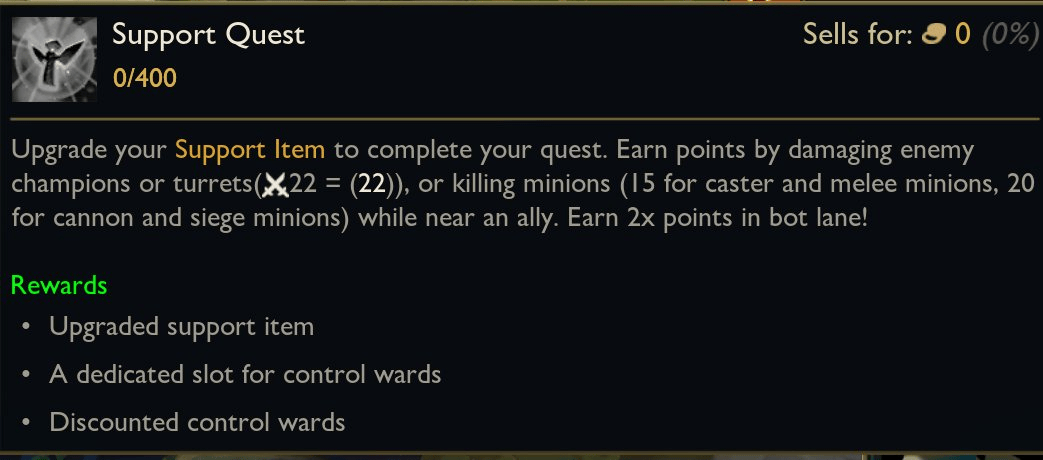 升级你的辅助装备来完成任务,攻击敌方英雄/防御塔每次获得22点,在附近有友方英雄时击杀远程/近战小兵获得15点,击杀炮车/超级兵获得20点)