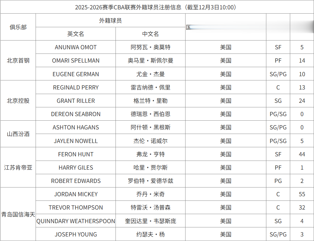 虎扑12月03日讯CBA官方更新外援注册信息:除四川男篮外其他球队均注册外援。