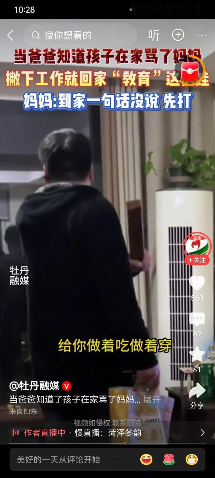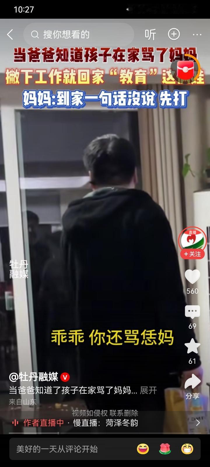 “这个爸爸火到上热搜了!”爸爸知道孩子在家骂了妈妈,撇下工作就回家了。妈妈:到家一句话没说,先打! 一爸爸正在公司忙着工作,突然得知儿子在家骂了妈妈。于是,二话不说,撇下工作就直奔家里。到家也是一句废话没有,拿着戒尺就是一顿打。 这个爸爸真的是好样儿的!教育完小儿子教育大儿子,打完还指着大儿子说:给你好吃好喝的,你还敢骂你妈?!你弟弟骂过妈妈吗?!你们这群小孩里见过谁骂妈妈吗?!你反了天了你! 面对爸爸的训斥,大儿子一句话也不敢说,小儿子也在一旁抹眼泪。 可以想象,此刻妈妈看到这个为自己“撑腰”的老公一定觉得心里是暖洋洋的。也会觉得老公作为一个父亲,在教育孩子上是尽职尽责的。 的确,百善孝为先,不尊重父母的孩子必须教育! 想起前些日子看到的一个视频,一个女孩对着试穿新衣服的妈妈说,你好胖,穿上去好丑呀。 结果这话被爸爸听见了,爸爸立马把女儿叫到身边说:妈妈为什么会变胖?!妈妈是因为怀你才变胖的。还有妈妈肚子上的疤,是因为生你才有的。你不感恩妈妈,不心疼妈妈,还嘲笑妈妈,你立马给妈妈道歉。 随后女孩也意识到了自己的错误,跑过去安慰妈妈,还亲了亲妈妈的脸蛋。 而看到这个视频,有人立马分享说,我和老婆感情不怎么好,我和儿子关系不错。但只要儿子敢说一句妈妈的不好,我立马就是开打,尊重父母是根本,这一点不能差。 有人说,最幸福的家庭氛围就是爸爸爱妈妈,这句话真的是一点没错。 其实,爸爸维护妈妈,不仅是为了当下的一点面子,更是在给孩子树立做人的底线。 孩子学会尊重父母,尤其是妈妈,才能学会尊重别人,将来才会懂得感恩和担当。 而爸爸爱妈妈,是家庭最温暖的底色,这份爱能让孩子在安全感中长大,也会让妈妈更有力量。 家不是讲道理的法庭,而是讲爱的港湾。当孩子看到爸爸用行动守护妈妈,他会明白:妈妈是家里的宝,不是可以随便顶撞的人。 再者,父母以身作则,比任何说教都有力。愿每个家庭都有这样的爸爸,让孩子在爱与尊重中成长,让“最幸福的家庭氛围是爸爸爱妈妈”成为生活的日常。 你们觉得呢?