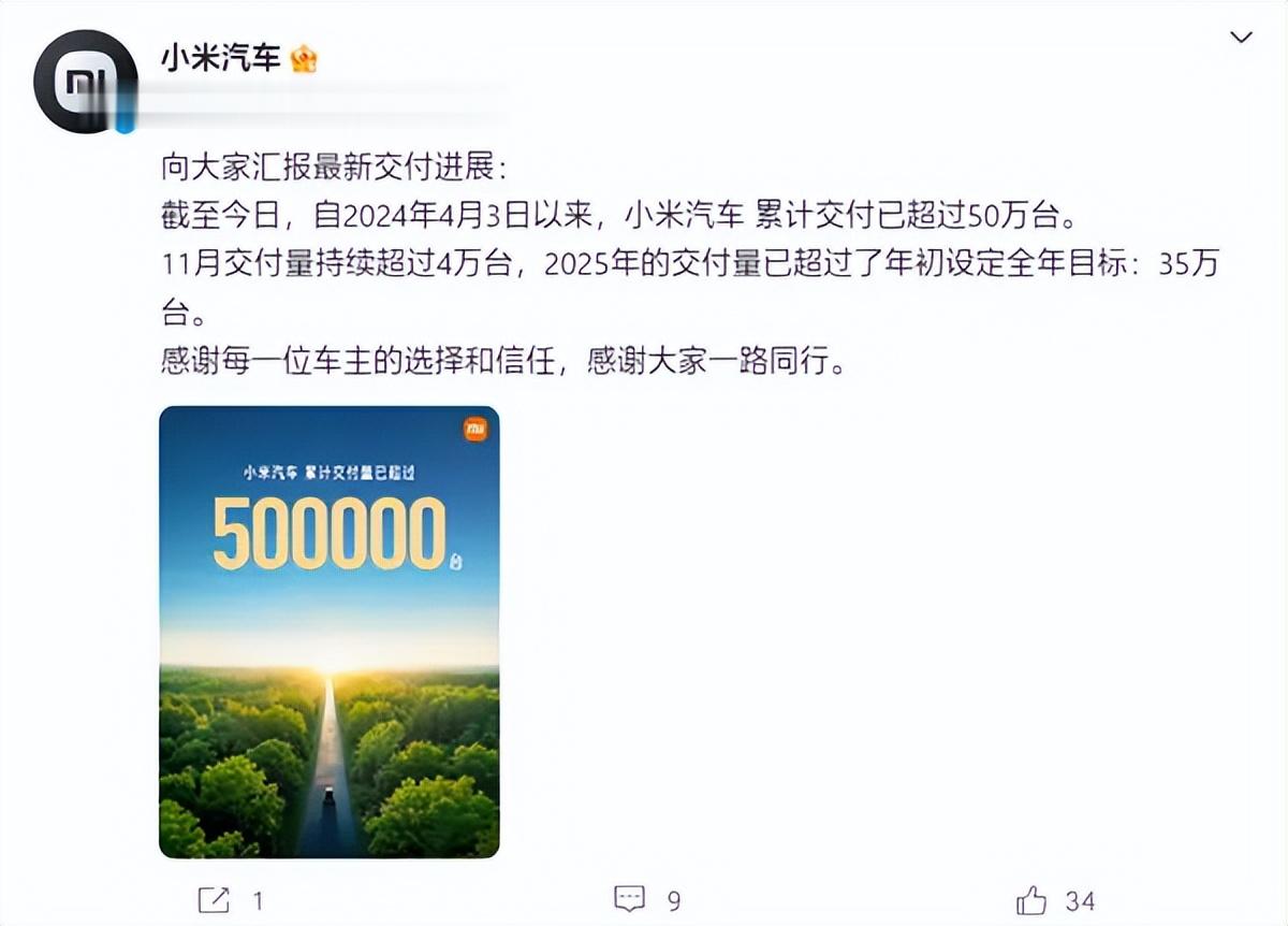 12月2日,据小米汽车官微消息,截至当日,自2024年4月3日以来,小米汽车累计交付已超过50万台。11月交付量持续超过4万台,2025年的交付量已超过了年初设定全年目标:35万台。