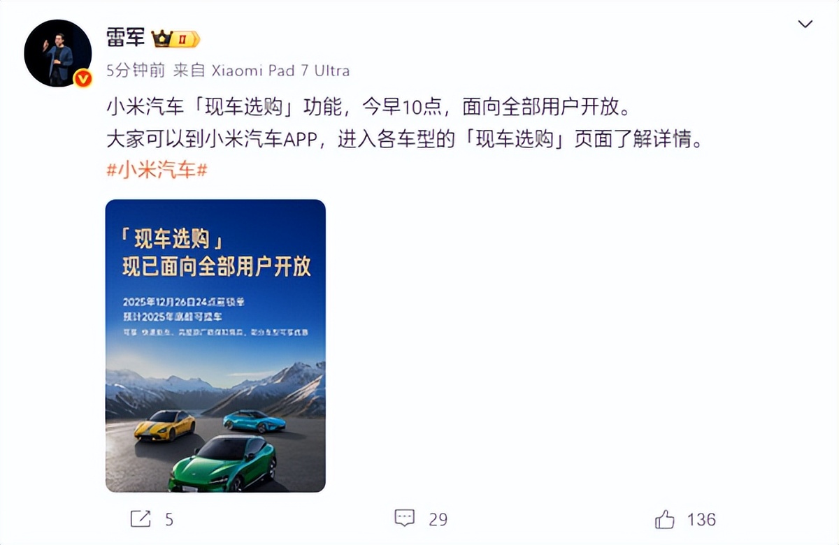 小米创办人,董事长兼CEO雷军发文宣布,小米汽车现车选购的功能于12月3日10点全面开放,大家可以到小米汽车APP选购。据介绍,现车包含全新现车、官方展车、准新车,已通过严格质检,可享快速提车、完整原厂质保和售后,部分车型可享优惠。