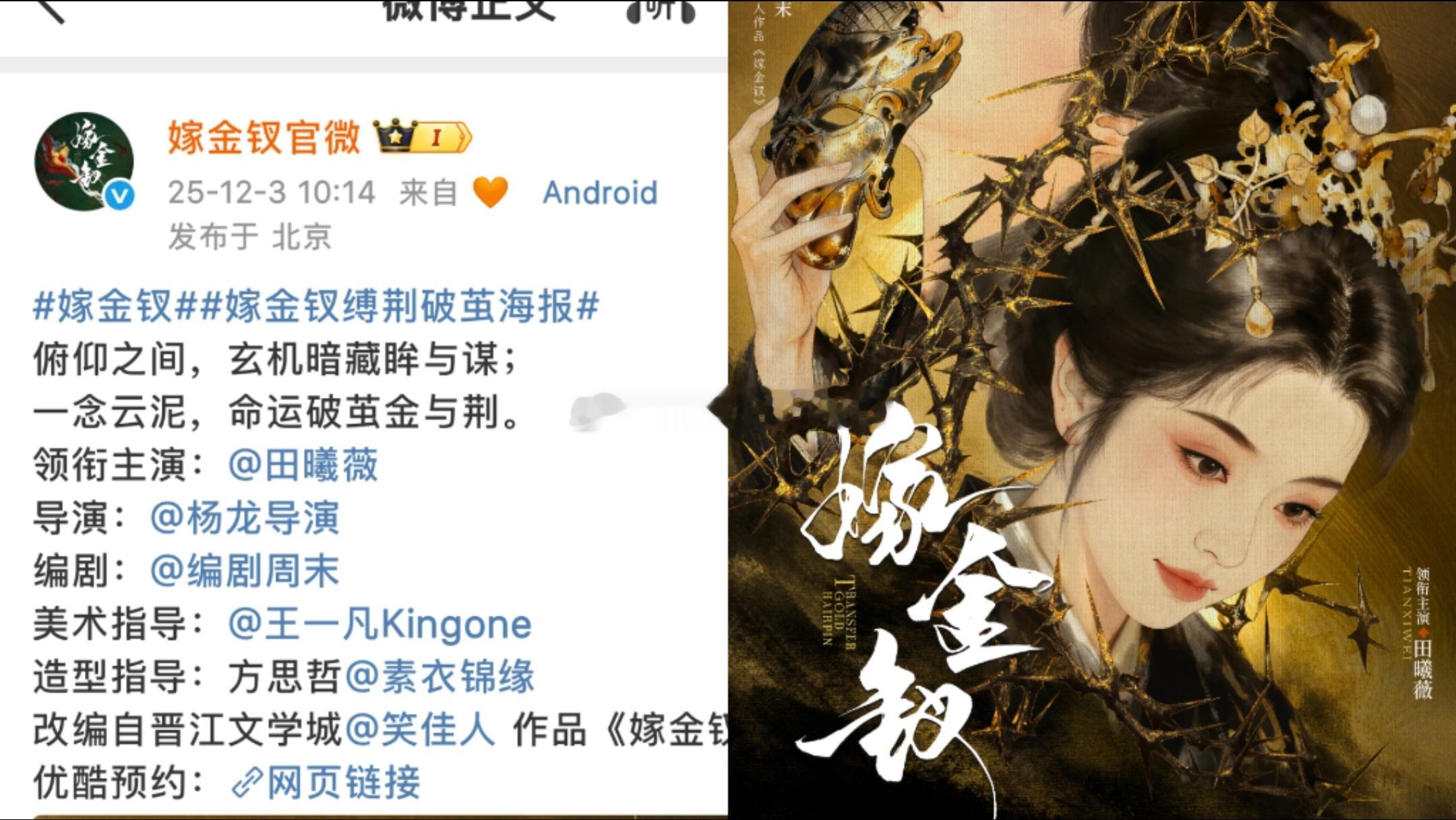嫁金钗官宣阵容并发布新海报,田曦薇领衔主演,单独官宣➕双卡点,大女主我们来了!