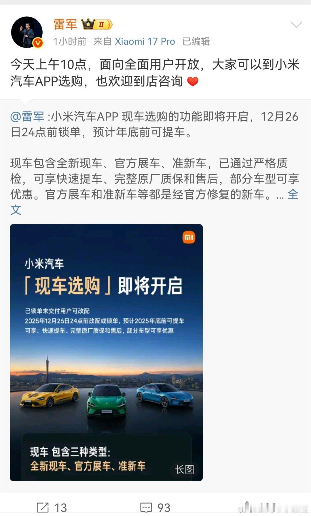 雷军:小米汽车APP现车选购功能今早10点面向全部用户开放有全新现车、官方展车和