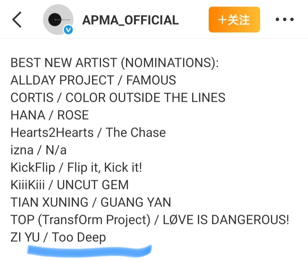 梓渝提名APMA最佳新人奖恭喜梓渝凭借单曲《Too Deep》提名亚洲流行音乐大奖APMA2025最佳新人奖🎉上线12分钟评论量突破百万,1小时评论破200w+,收藏量破70w+,空降15个榜单登顶第一,练习室版运镜四版视频播放量均破百万,登世趋多国趋势海内外火热!梓渝TooDeep提名亚洲流行音乐大奖