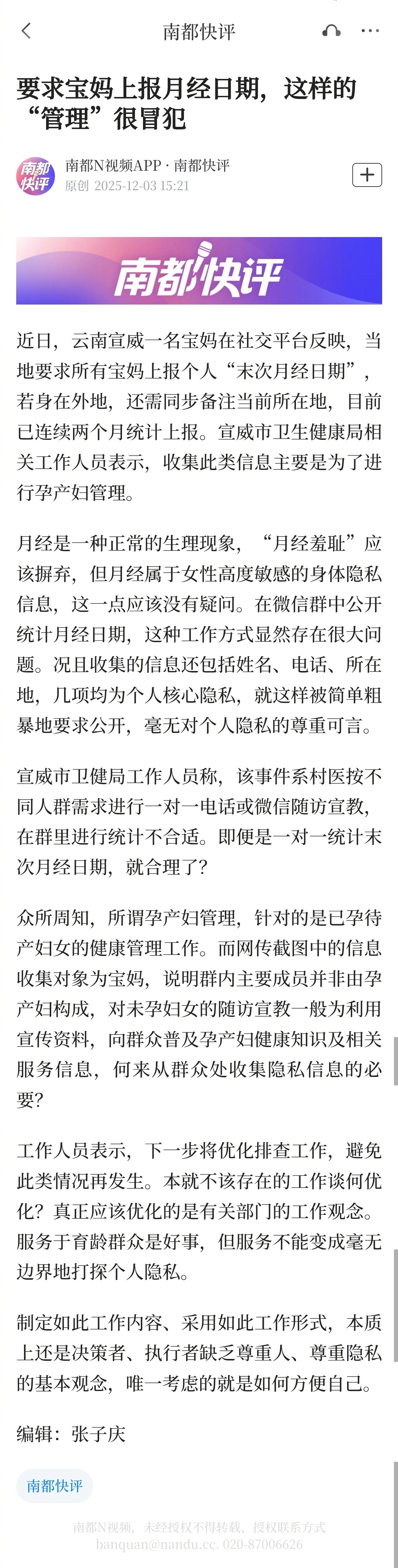 #云南一地在微信群公开统计月经日期#【要求宝妈上报月经日期,这样的“管理”很冒犯】#公开要求宝妈上报月经日期很冒犯##宣威回应要求宝妈上报月经日期#近日,云南宣威一名宝妈在社交平台反映,当地要求所有宝妈上报个人“末次月经日期”,若身在外地,还需同步备注当前所在地,目前已连续两个月统计上报。宣威市卫生健康局相关工作人员表示,收集此类信息主要是为了进行孕产妇管理。月经是一种正常的生理现象,“月经羞耻”应该摒弃,但月经属于女性高度敏感的身体隐私信息,这一点应该没有疑问。在微信群中公开统计月经日期,这种工作方式显然存在很大问题。况且收集的信息还包括姓名、电话、所在地,几项均为个人核心隐私,就这样被简单粗暴地要求公开,毫无对个人隐私的尊重可言。宣威市卫健局工作人员称,该事件系村医按不同人群需求进行一对一电话或微信随访宣教,在群里进行统计不合适。即便是一对一统计末次月经日期,就合理了?众所周知,所谓孕产妇管理,针对的是已孕待产妇女的健康管理工作。而网传截图中的信息收集对象为宝妈,说明群内主要成员并非由孕产妇构成,对未孕妇女的随访宣教一般为利用宣传资料,向群众普及孕产妇健康知识及相关服务信息,何来从群众处收集隐私信息的必要? 工作人员表示,下一步将优化排查工作,避免此类情况再发生。本就不该存在的工作谈何优化?真正应该优化的是有关部门的工作观念。服务于育龄群众是好事,但服务不能变成毫无边界地打探个人隐私。