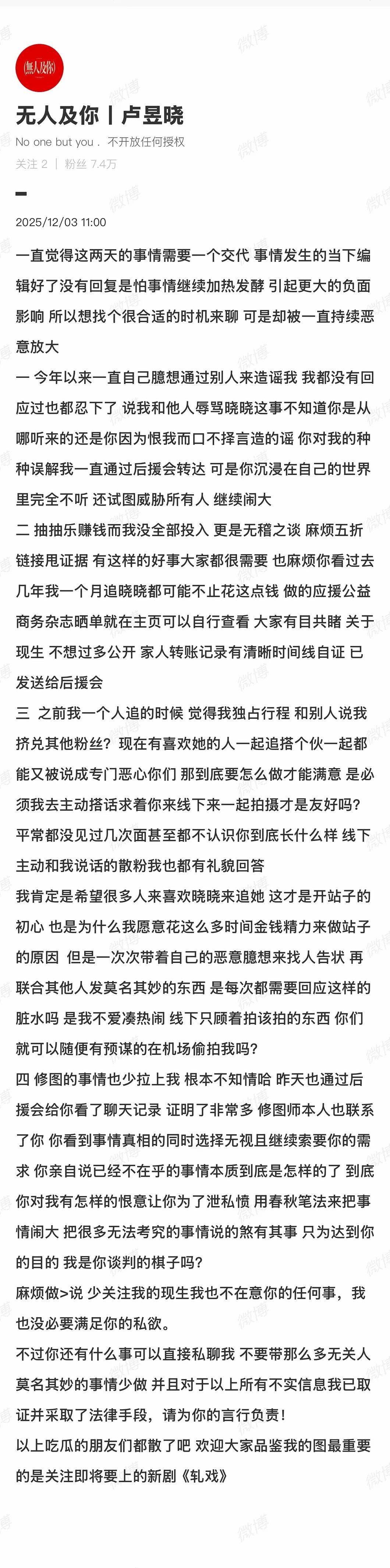 卢昱晓站姐无人及你发文回应卢昱晓站姐无人及你发文回应了,叽里咕噜一长串,但重要的点一个都没回应,没有回应私联工作室和卢昱晓同进同出剧组的原因,回应的都是站姐之间小打小闹,这样模糊重点是不是也侧面证实了确实和gzs私联了?