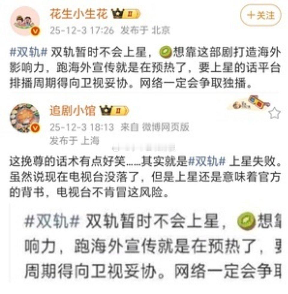 瓜主因为《双轨》上星问题争论起来了🚬一个说:双轨暂时不上星,是因为爱奇艺要打造海外影响力,一个说:这是在挽尊,其实就是双轨上星失败,上星意味着官方背书,电视台不肯冒着风险。