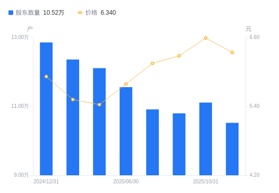 近一年(2024年12月31日至2025年10月31日),华安证券A股股东户数从12.86万户,减低至11.11万户,降幅13.58%,区间股价上涨5.61%。