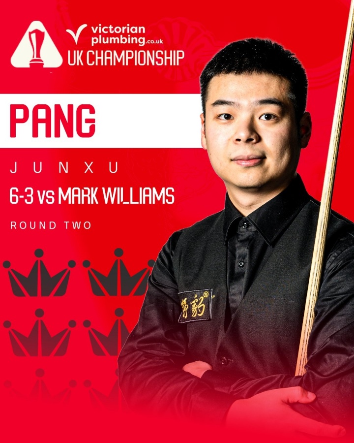 直播吧12月04日讯2025斯诺克英锦赛16进8轮次,全场比赛马克·威廉姆斯打出单杆101、112分,庞俊旭打出单杆76、53、116分。开局庞俊旭一路扩大领先优势,一度4-1领先威廉姆斯,威廉姆斯第六局轰出112分破百连追两局,将比分追到3-4,随后庞俊旭打出单杆51、116分锁定胜局,以6-3的比分战胜威廉姆斯,成为首位晋级八强的中国球员!