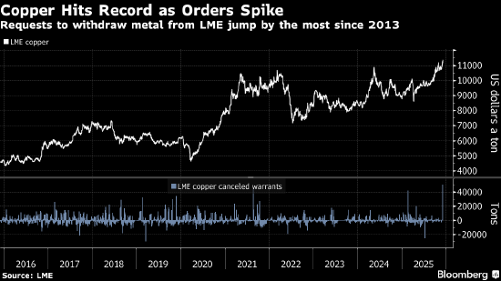 铜价周三大涨并再创新高,此前投资者从伦敦金属交易所(LME)仓库中提取铜的订单激增,进一步加剧了对供应的担忧,因为市场本已担心潜在的美国关税可能会引发全球供应紧张。
