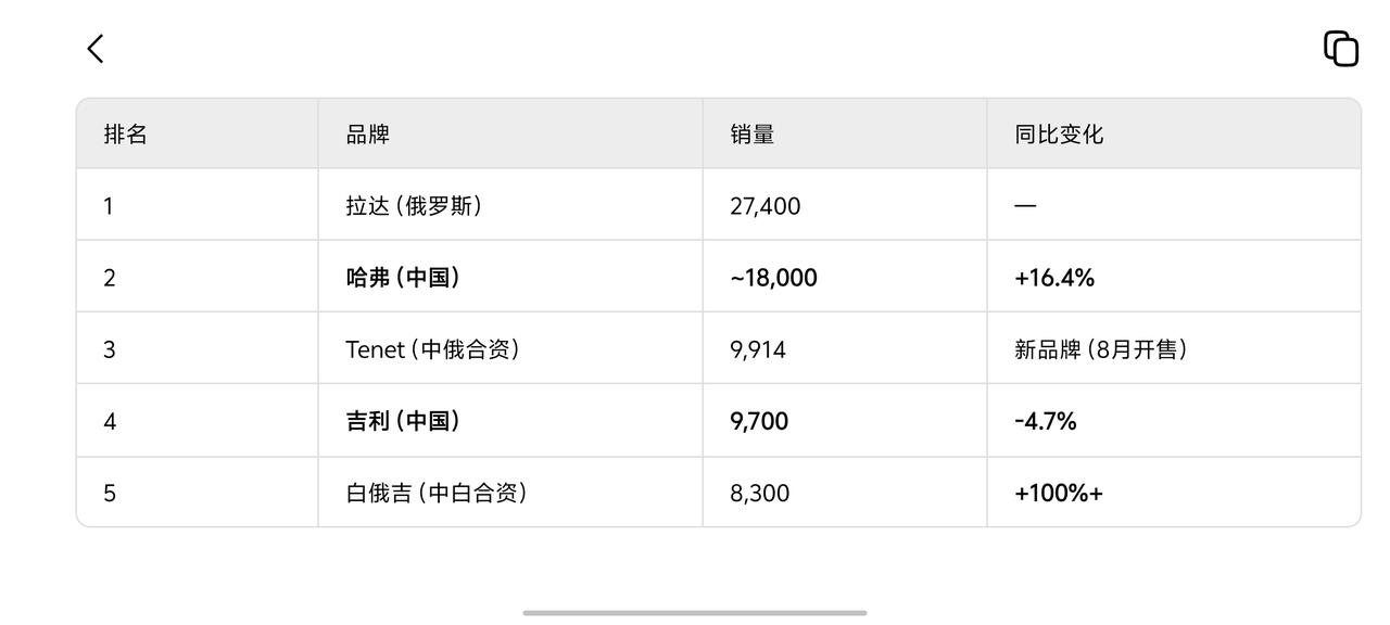 五占四,俄罗斯车市中国品牌继续霸榜! 俄媒最新发布数据,俄罗斯汽车销量回升,中国汽车品牌继续表现亮眼。 截止2025年11月俄罗斯私家车新车累计销量119万辆,同比下滑17.8%, 其中11月销量12.79万辆,同比增5%。 11月当月销量前五强中,中国相关品牌占据4席: 首位是俄罗斯拉达,以2.74万辆登顶; 哈弗紧随其后售近1.8万辆,同比涨16.4%; 中俄合资品牌Tenet(8月开售)售9914辆排第三; 吉利售9700辆居第四(同比降4.7%);中白合资白俄吉售8300辆,同比翻倍。 文章来源:俄罗斯卫星社 数据来源:俄罗斯机动车统计网