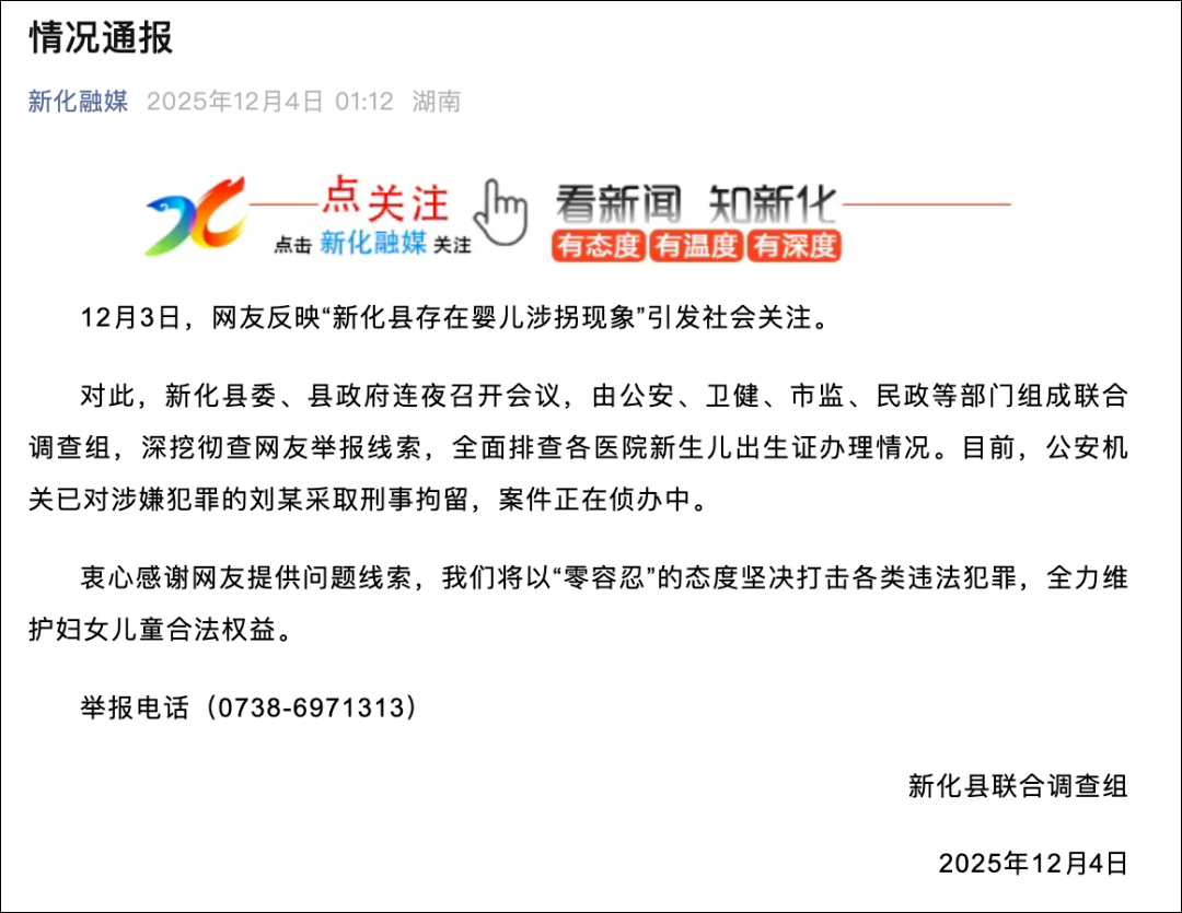 通报称,12月3日,网友反映“新化县存在婴儿涉拐现象”引发社会关注。