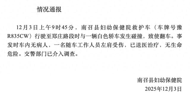 12月3日上午9时45分,南召县妇幼保健院救护车(车牌号豫R835CW)行驶至郑庄路段时与一辆白色轿车发生碰撞,致使翻车。事发时车内无病人,一名随车工作人员左肩受伤,已送医治疗,无生命危险。交警部门已介入调查。
