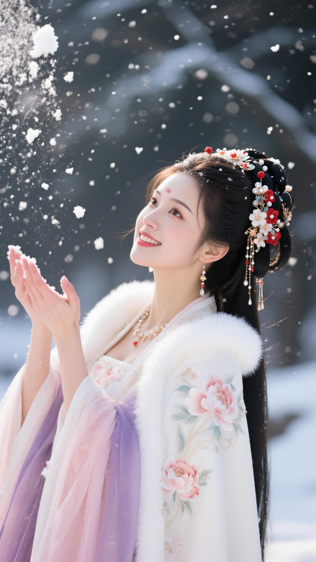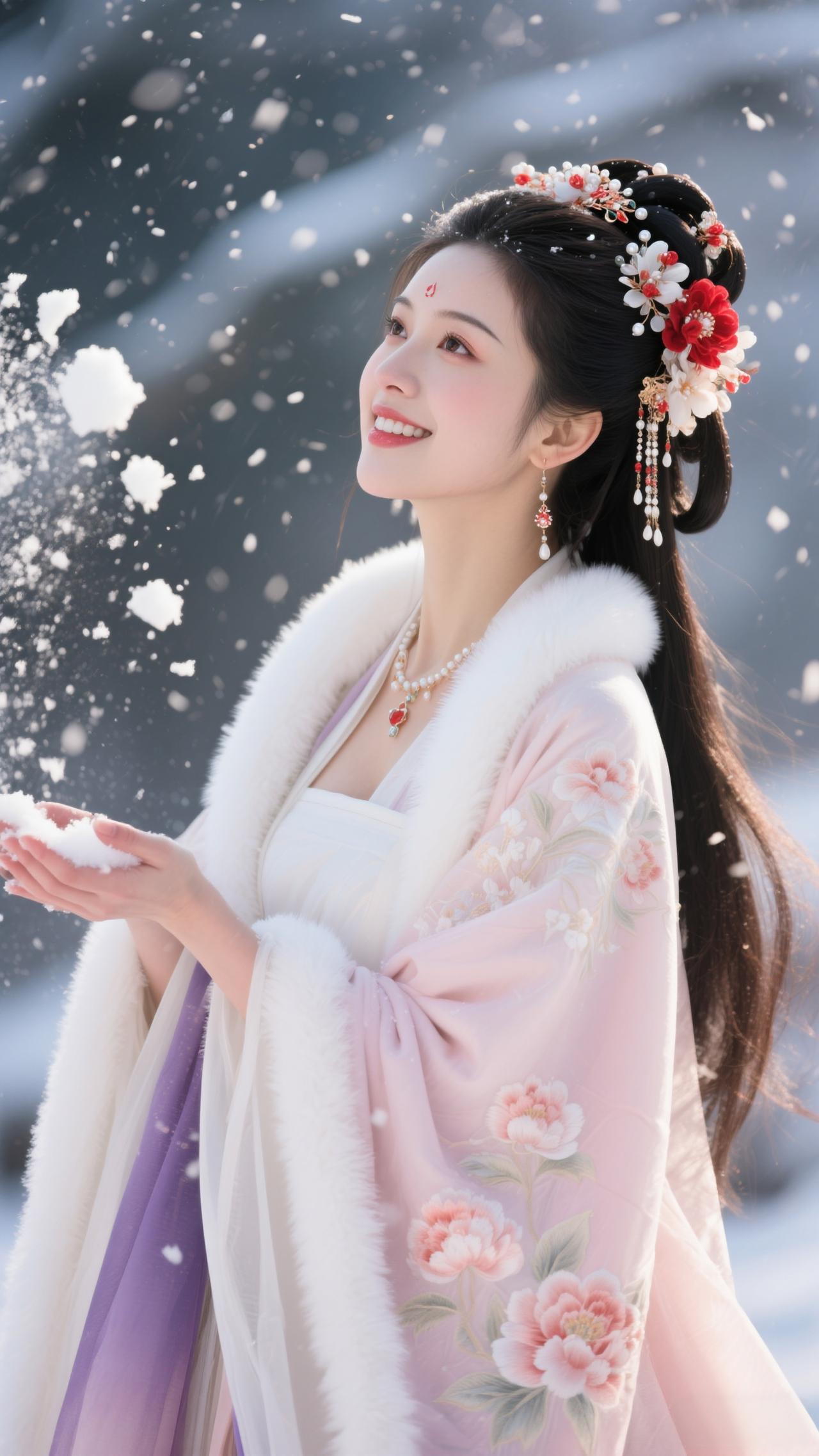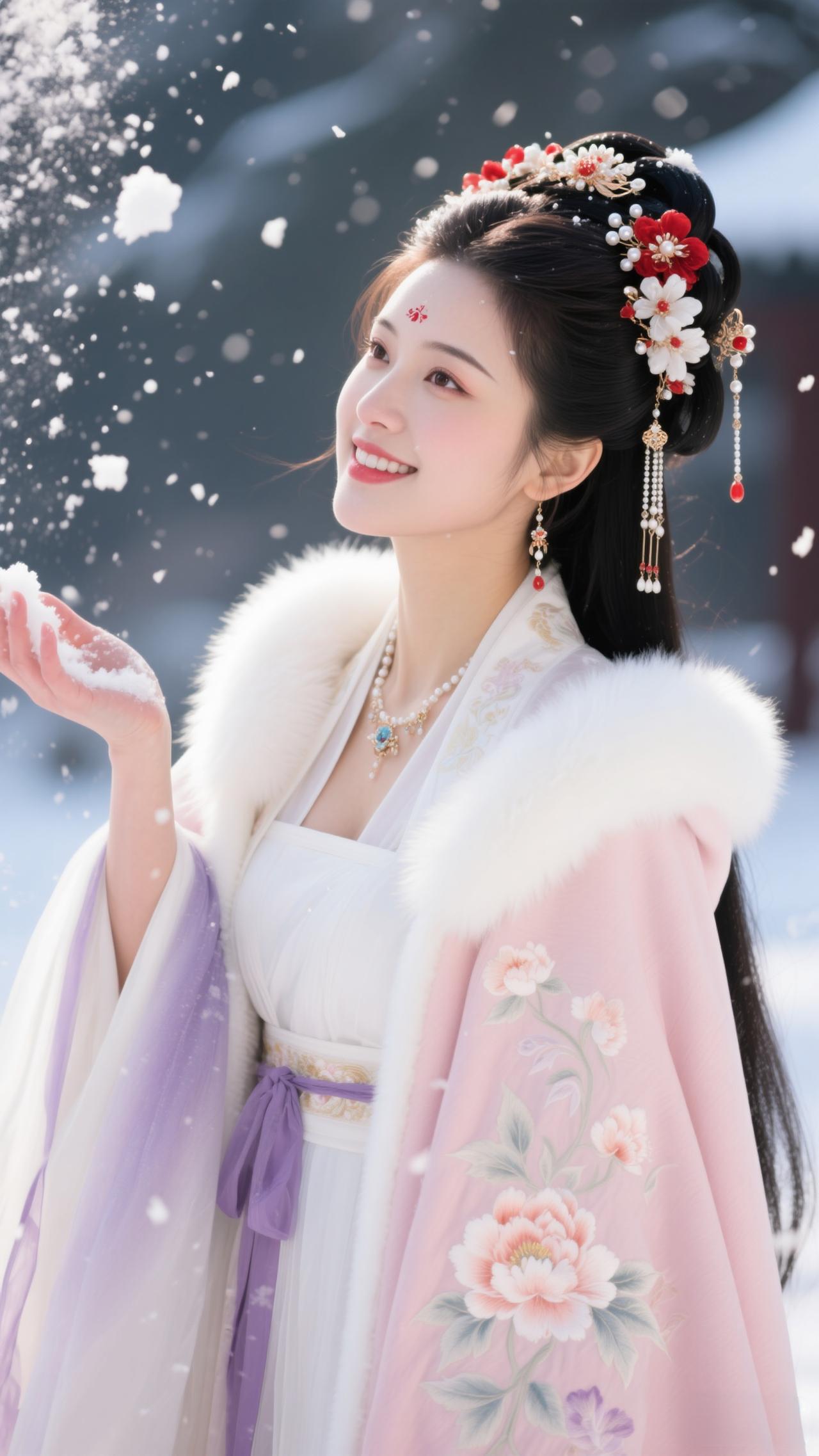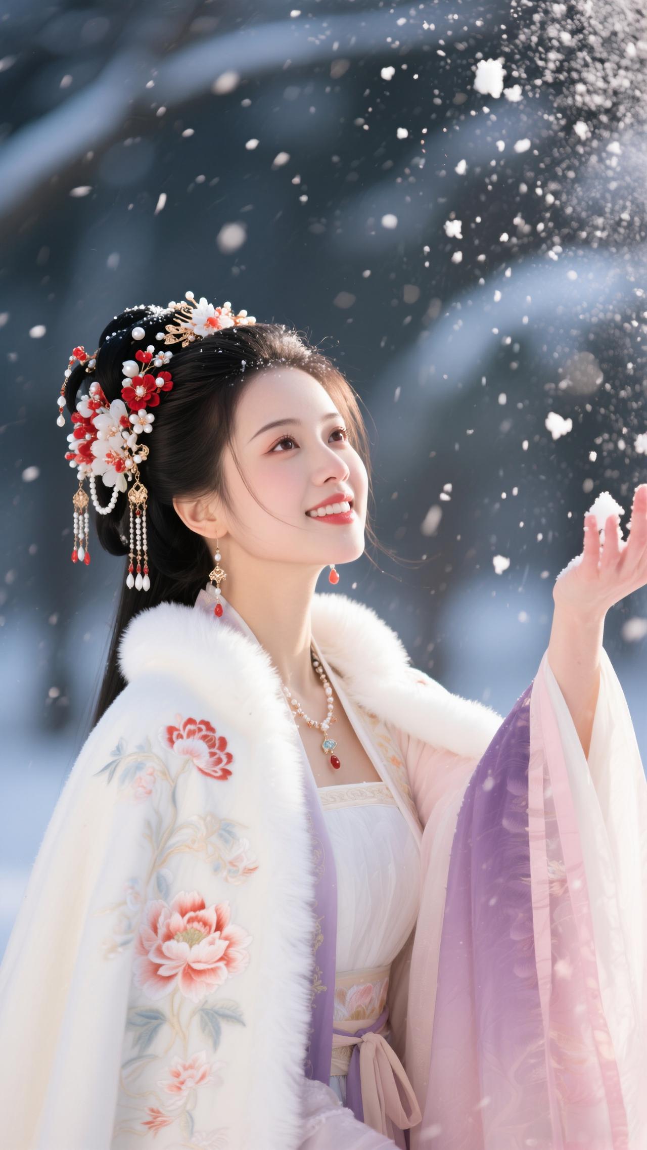 鹧鸪天·雪掌藏春 罗袂生香立雪氛,粉绡轻覆玉光温。花簪暗缀玲珑韵,掌雪明承笑