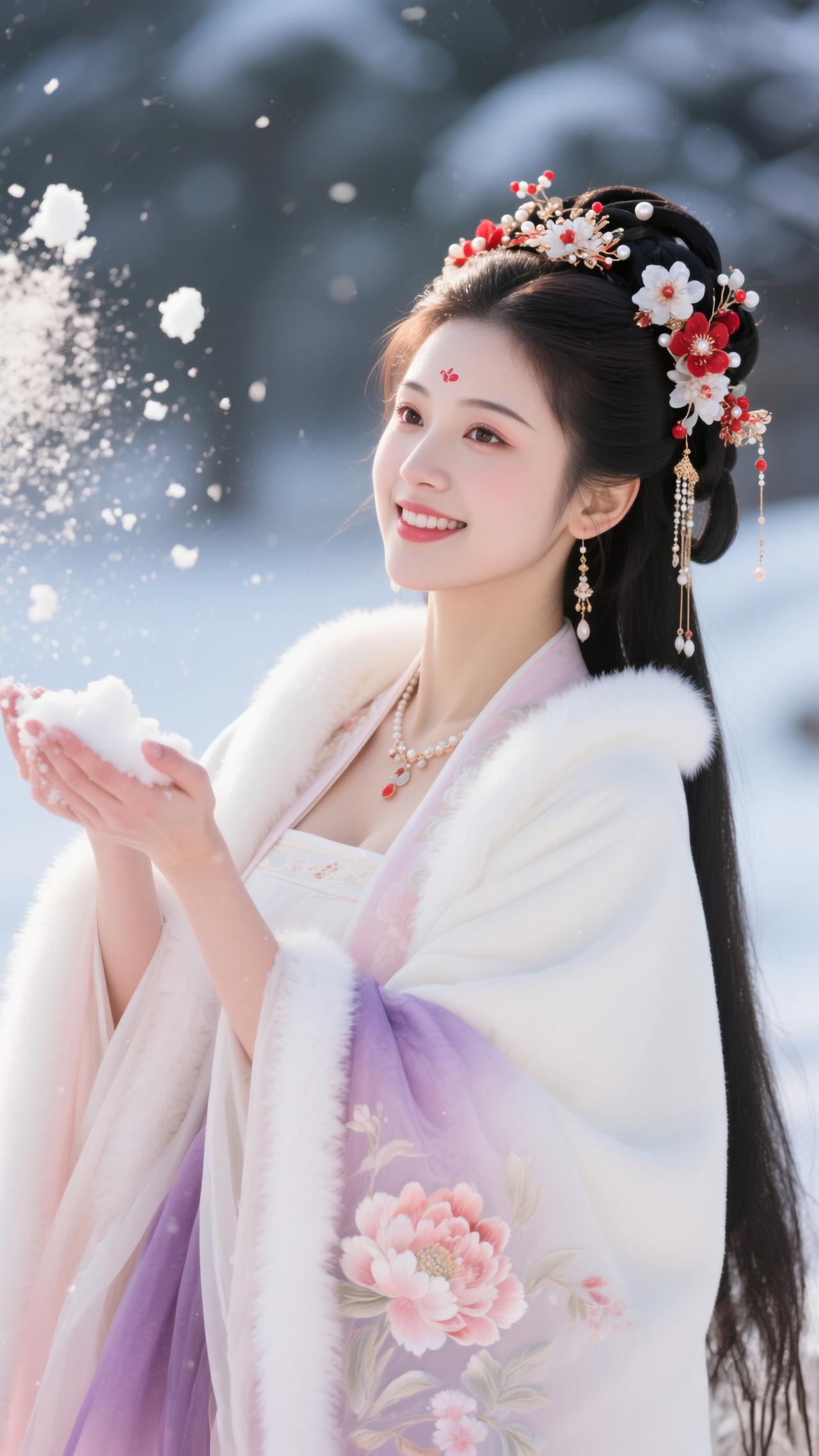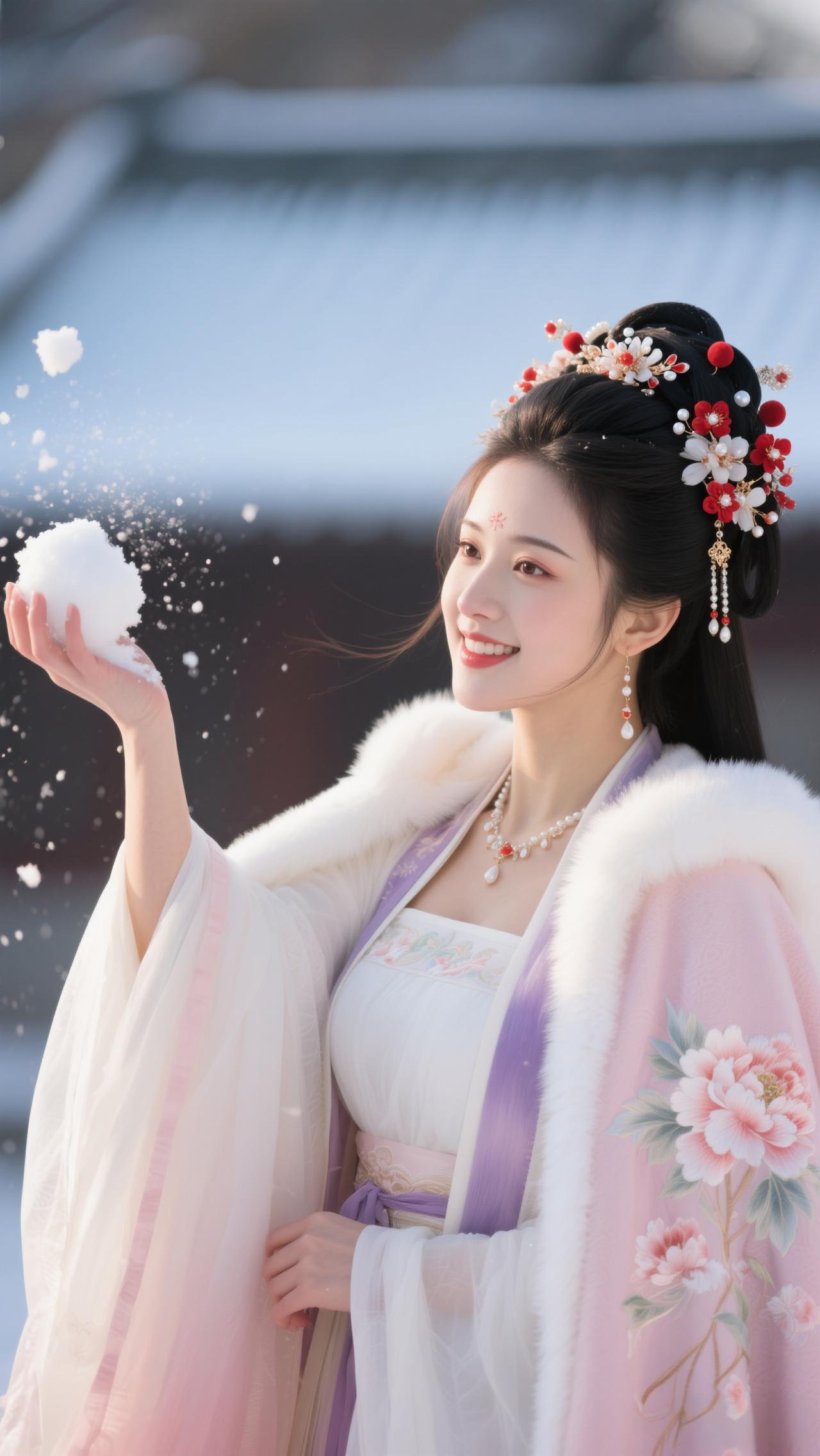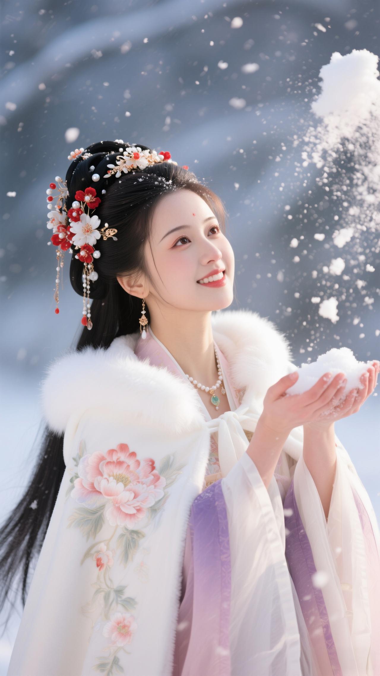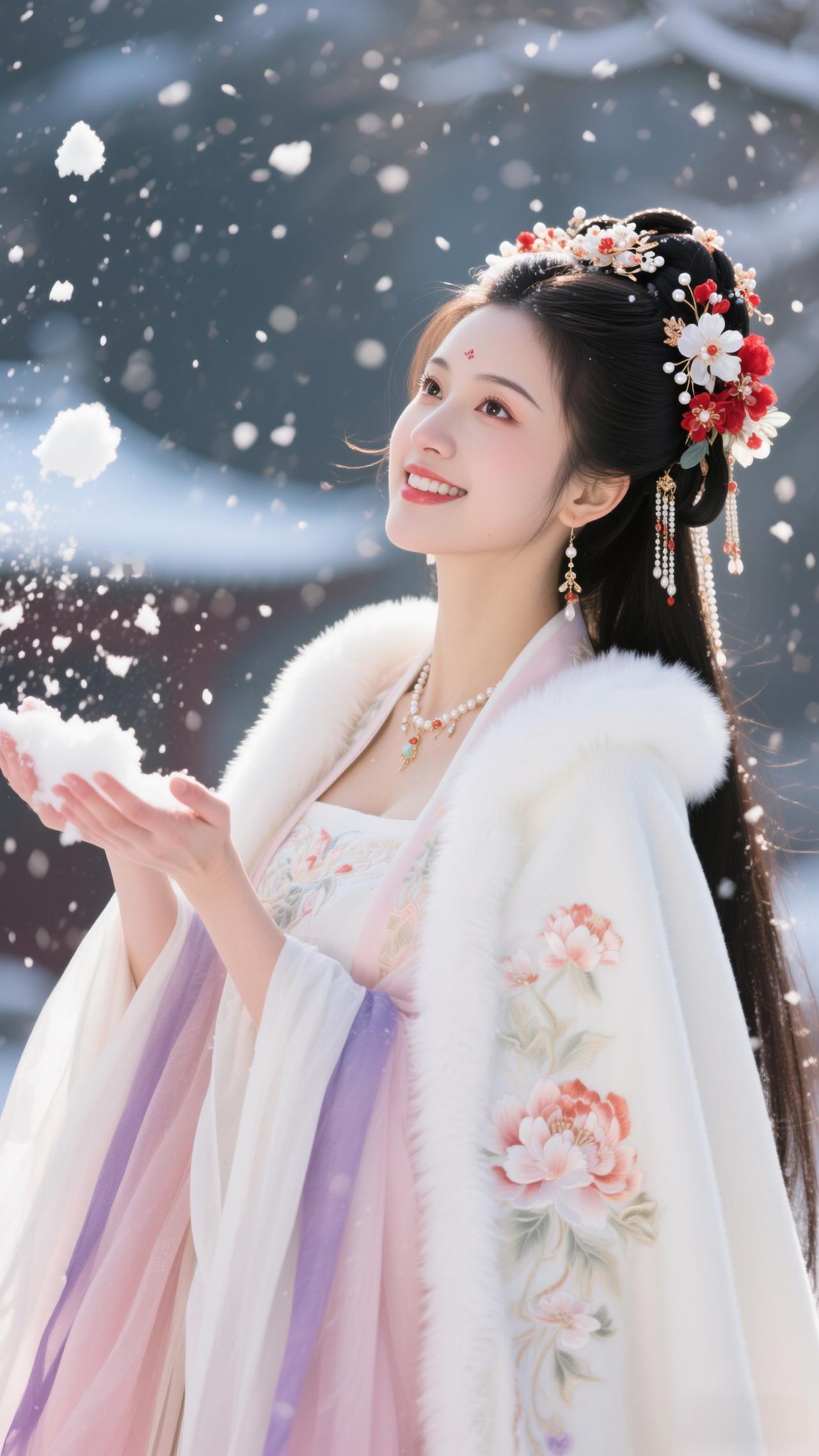 鹧鸪天·雪掌藏春 罗袂生香立雪氛,粉绡轻覆玉光温。花簪暗缀玲珑韵,掌雪明承笑