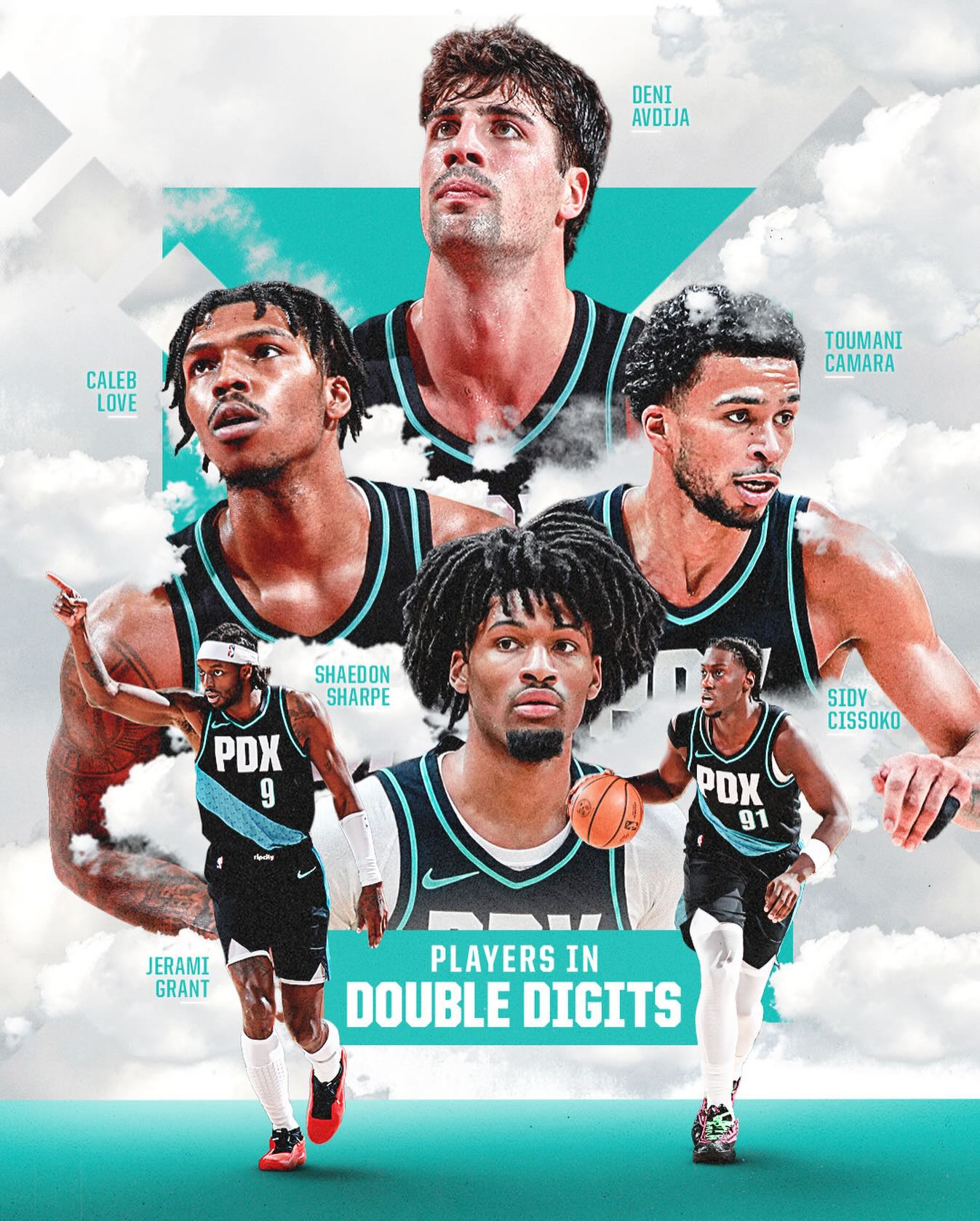 hadthewholesquadfeasting6guysindoublefigurescoringinourwinvstheCavs:DeniAvdija-27PTSCalebLove-20PTSShaedonSharpe-20PTSToumaniCamara-17PTSJeramiGrant-16PTSSidyCissoko-11PTS
