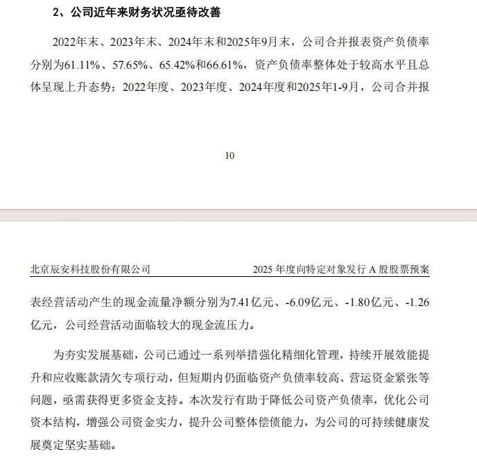 公开财报显示,辰安科技公司近年来的财务状况亟待改善。资产负债率方面,2022年末、2023年末、2024年末和2025年9月末,公司合并报表资产负债率分别为61.11%、57.65%、65.42%和66.61%,整体处于较高水平且呈上升趋势。