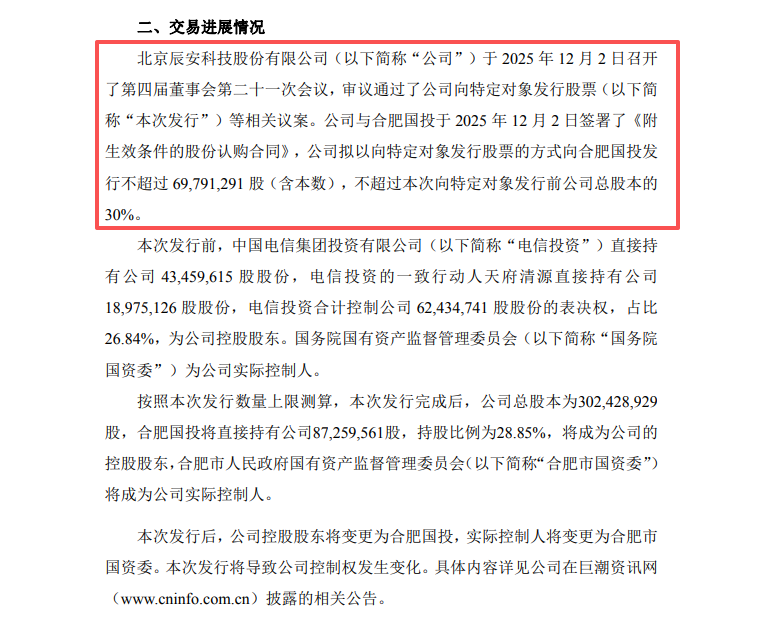 12月2日,北京辰安科技股份有限公司(以下简称“辰安科技”)发布公告,公司拟向特定对象合肥国有资本创业投资有限公司(以下简称“合肥国投”)发行股票,按照本次发行的股票数量上限计算,本次发行的股票数量不超过本次发行前公司总股本的30%,募集资金总额不超过14.19亿元(含本数)。本次向特定对象发行A股股票构成关联交易。