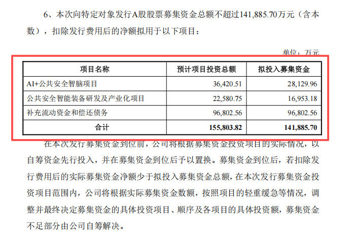 资金用途主要为AI+公共安全智脑项目、公共安全智能装备研发及产业化项目和补充流动资金和偿还债务。其中,AI+公共安全智脑项目拟投入2.81亿元;公共安全智能装备研发及产业化项目拟投入1.70亿元;补充流动资金和偿还债务拟投入9.68亿元。
