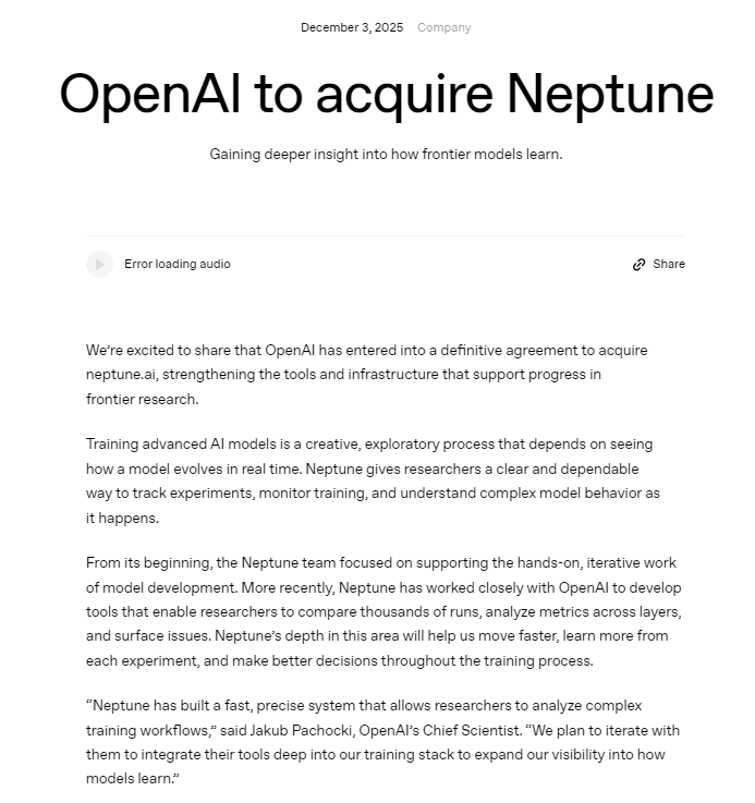 上证报中国证券网讯(实习生杨艳莹记者王宙洁)OpenAI当地时间12月3日宣布,已达成收购Neptune的最终协议,以深入了解前沿模型如何学习。Neptune是一家专注于为AI企业提供模型训练过程监控、调试与评估工具的初创企业。此前Neptune与OpenAI已合作开发了一款指标仪表盘,为基础模型研发团队提供支持。
