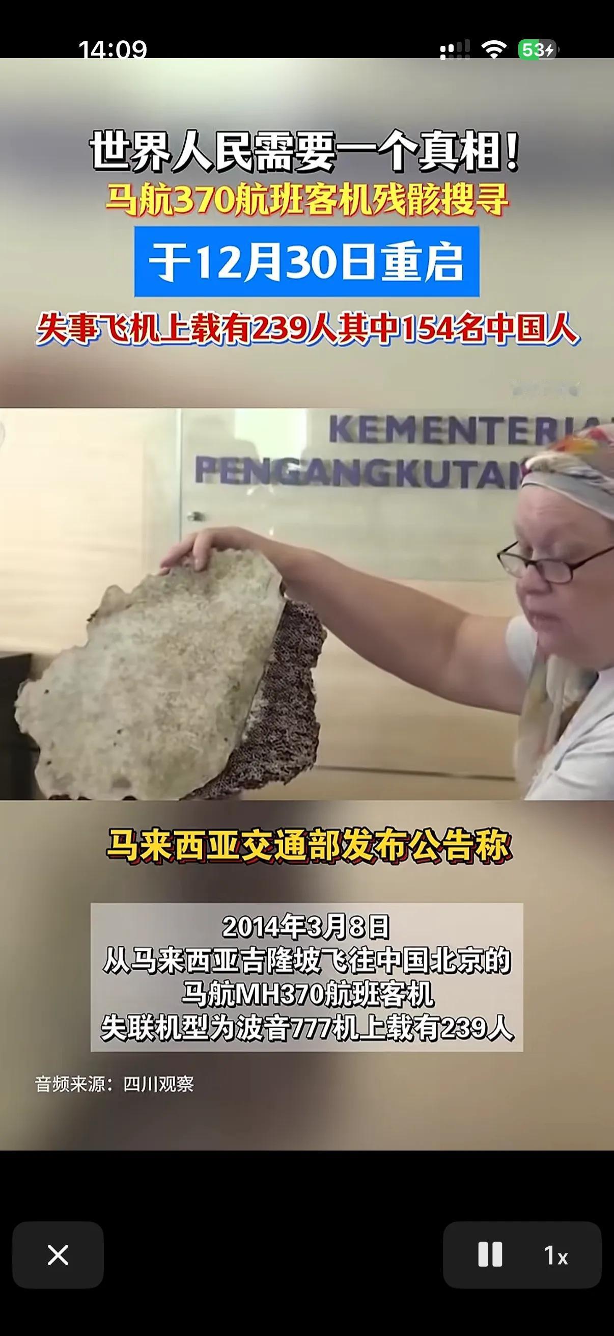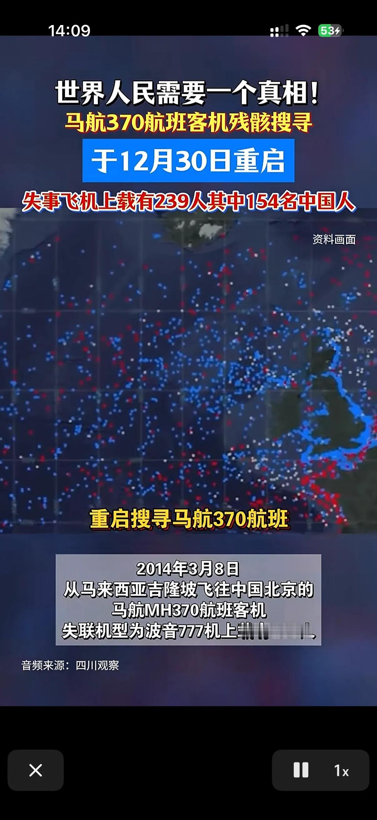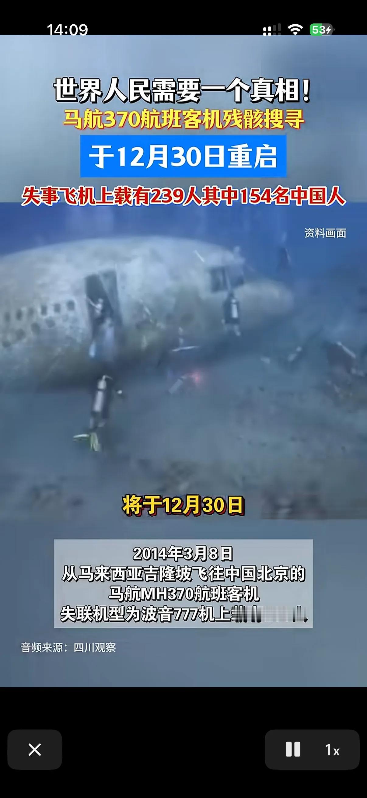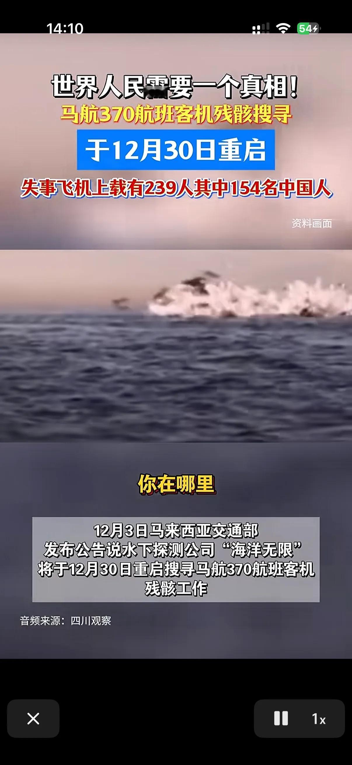 马航370航班重启搜寻调查! 马航370航班失踪已经超11年了~!可以说很多热都快忘记马航370了! 现在马来西亚再次重启马航370失踪和飞机残骸! 为的就是给全世界一个真相!当年马航370上有154名中国人! 现在马来西亚交通部发布公告称水下探测公司海洋无限将于12月30日重新探测搜寻马航370的残骸,就是不知道这次真的能调查清楚飞机失事的原因么? 也许有的事情的真相注定无法真相大白毕竟已经过去整整十一年了!有些证据也是会被时间磨灭!