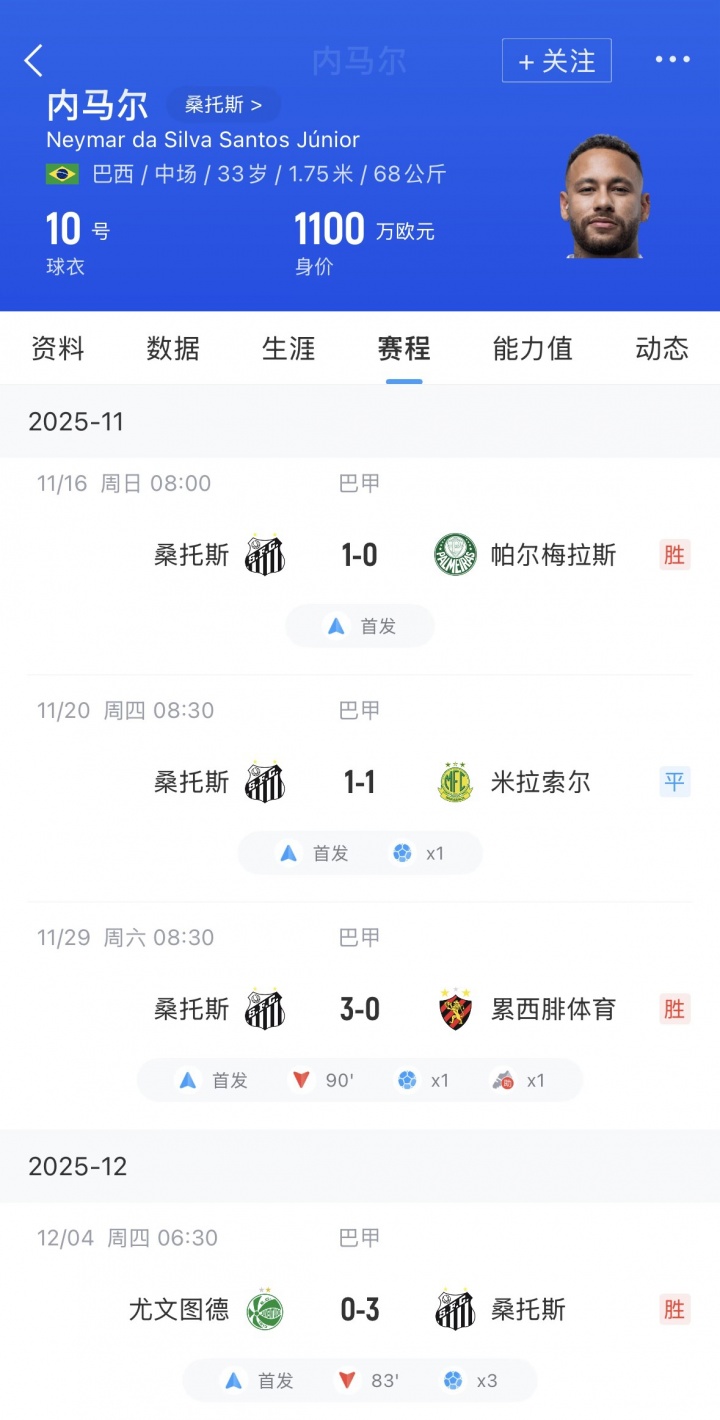 在昨晚巴甲第37轮,桑托斯3-0战胜尤文图德,内马尔戴帽,帮助球队远离降级区。