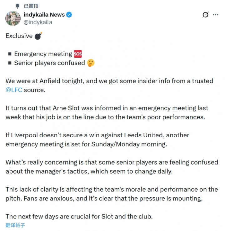 绿帽哥表示,他们从可靠的利物浦消息人士那里获得了一些内部消息。斯洛特在上周的一次紧急会议上被告知,由于球队表现不佳,他的帅位岌岌可危。