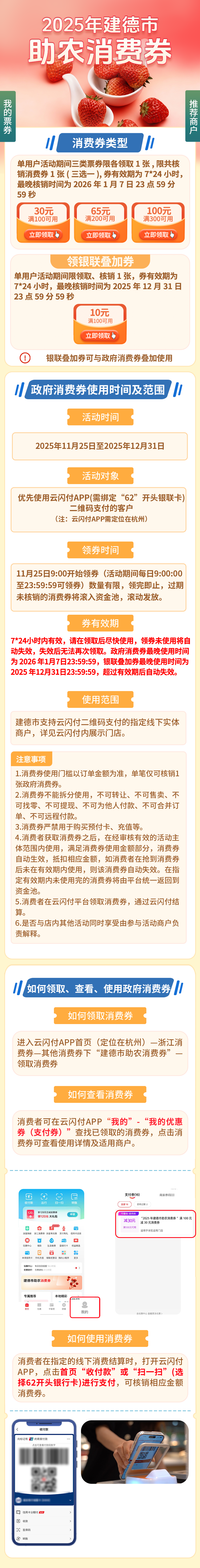 下载并打开中国银联官方的云闪付APP,依次进入“浙江消费券”—“其他消费券”—“建德助农消费券”专区即可申领,每人领取一次,领取后7天内消费有效,其间还可以叠加领取银联10元通用消费券。