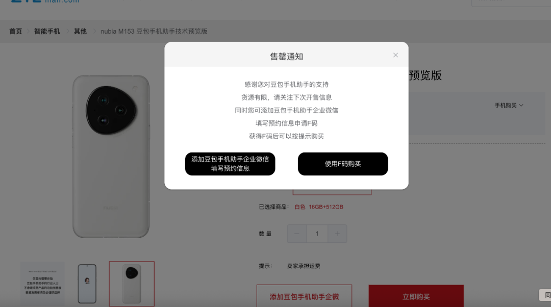 12月2日,中兴商城官网显示,售价3499元的“豆包助手”手机已售罄。