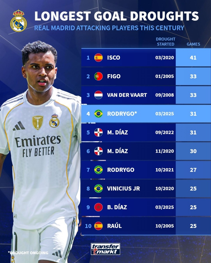 据德转统计,罗德里戈31场球荒场数在本世纪皇马进攻球员上可以排到第4位,仅次于伊斯科、菲戈和范德法特的球荒场数。
