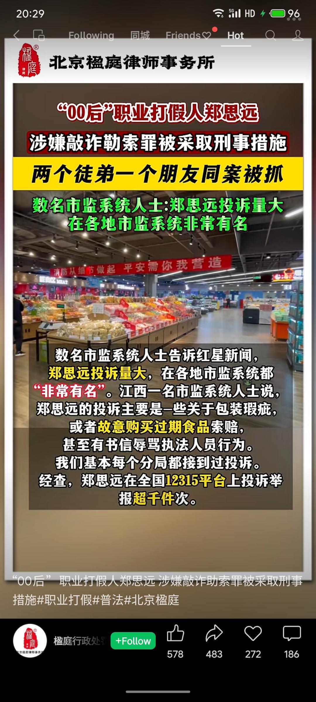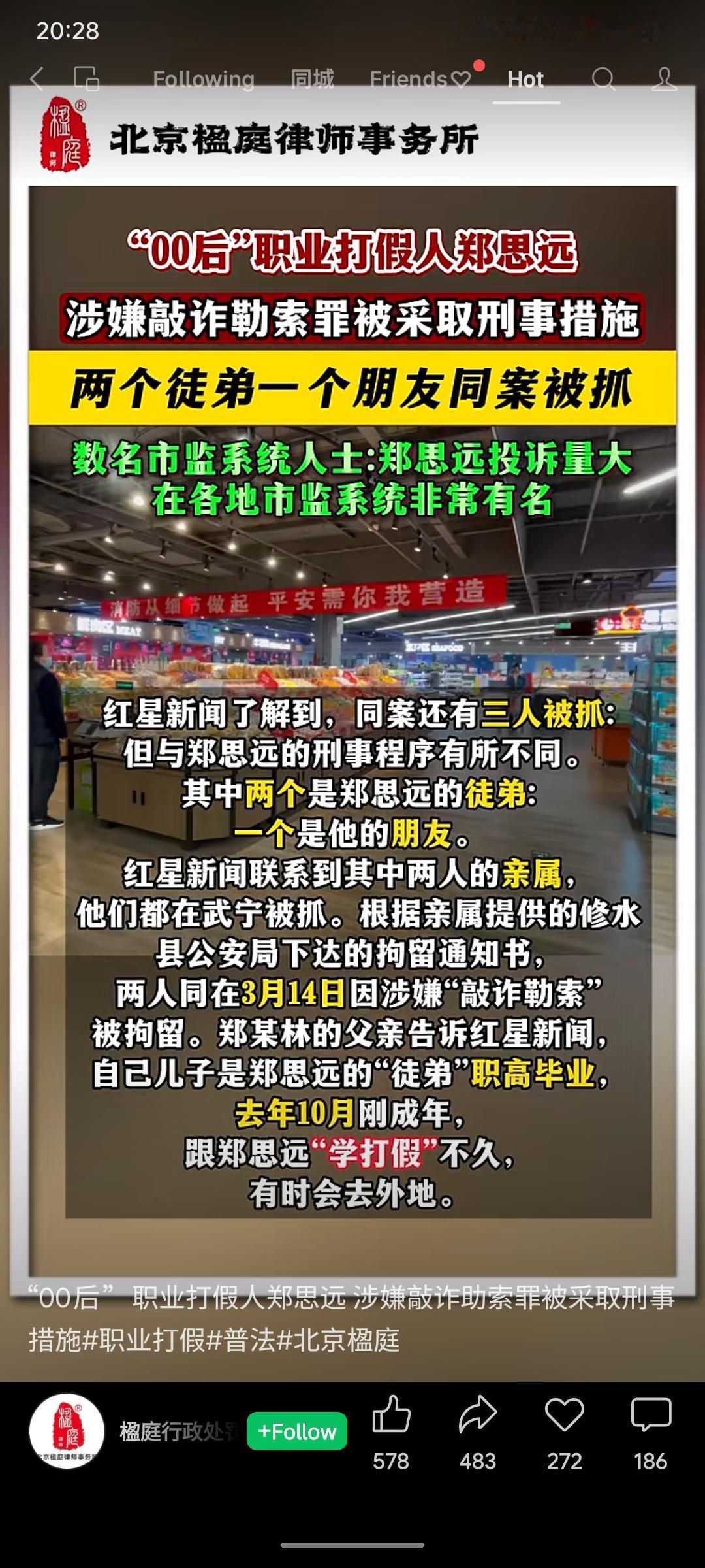 “00后”职业打假人郑思远因涉嫌敲诈勒索被采取刑事强制措施。其投诉举报超千件,主要以包装瑕疵、过期食品为由向小商户索赔。两名“徒弟”及一名朋友同案被抓,案件正在侦办。