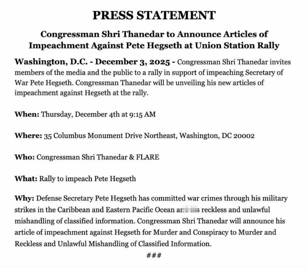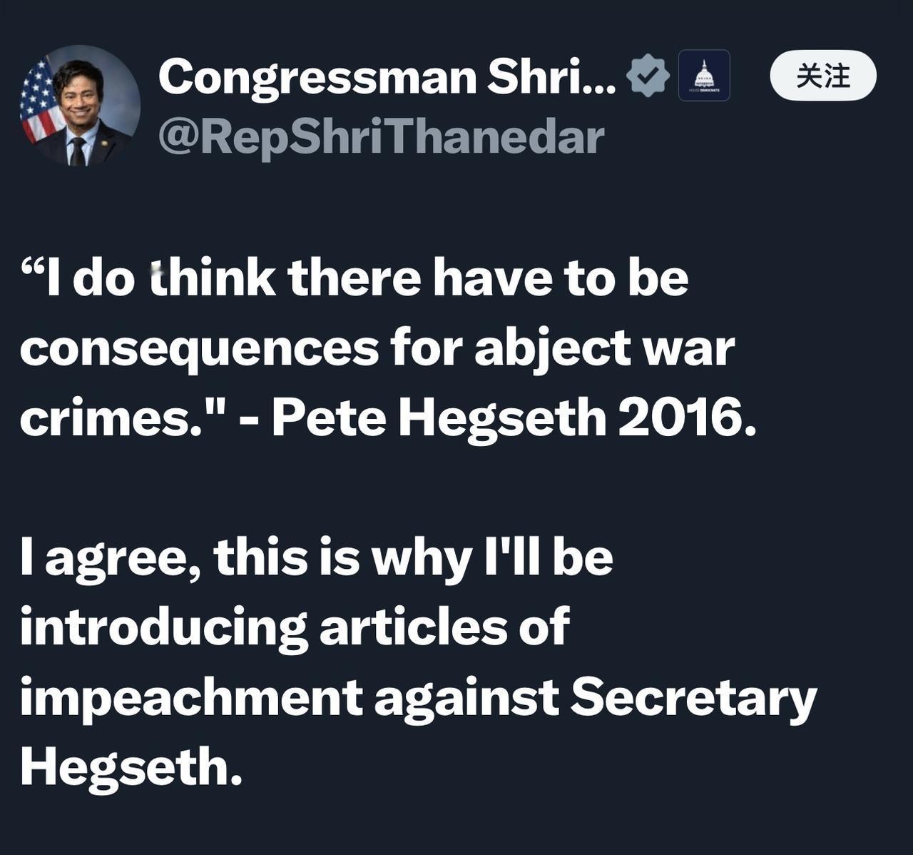 美国民主党众议员Shri Thanedar以“谋杀”罪对战争部长赫格塞斯Pete Hegseth提出弹劾条款。 ““我认为,对于骇人听闻的战争罪行,必须追究责任。”——皮特·赫格塞斯 2016 年。 我同意,这就是为什么我要对赫格塞斯部长提出弹劾条款。”