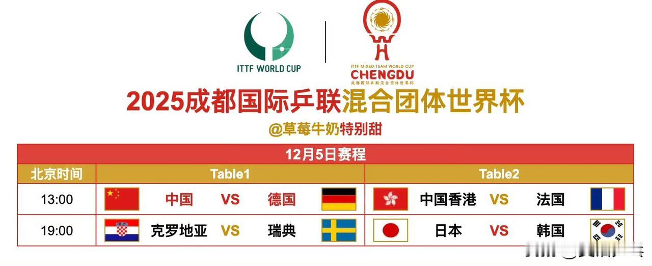 12月5日全日赛程 13:00 🇨🇳中国VS德国🇩🇪 🇭🇰中国香港VS法国🇫🇷 19:00 🇭🇷克罗地亚VS瑞典🇸🇪 🇯🇵日本VS韩国🇰🇷