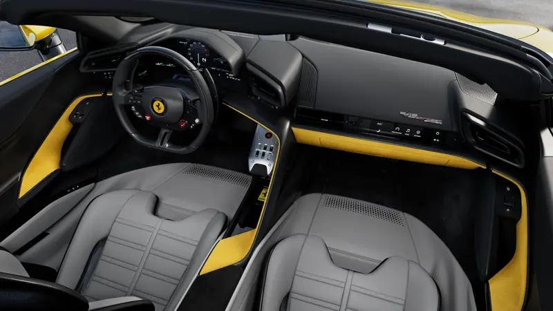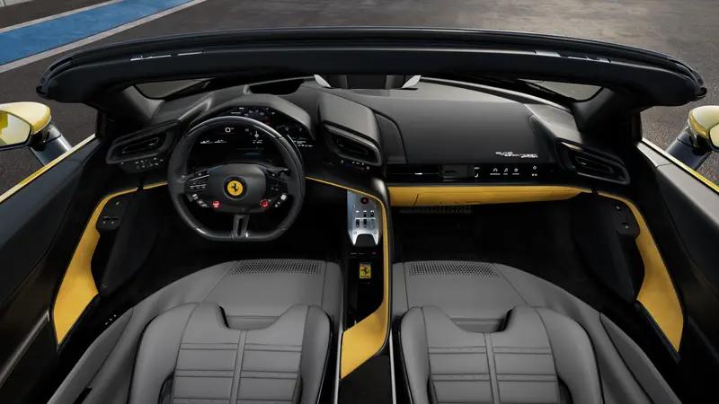 内饰方面,法拉利849TestarossaSpider在法拉利Berlinetta车型结构布局的基础上,融合了单座赛车所采用的水平仪表盘和座舱设计。仪表盘上方,铝质边框勾勒出字母C形出风口,营造出悬浮的视觉效果。仪表盘上下部分由一条对比鲜明的水平饰带衔接,该区域整合了主要控制按键与副驾驶显示屏。仪表盘下部两个极具建筑美感的帆形结构元素巧妙整合了一系列控制功能,其中位于方向盘侧的帆形构件采用悬浮式设计,并集成了源自法拉利F80的换挡机构。