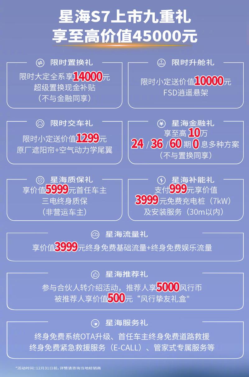 具体来看,即日起至2025年12月31日24:00前完成购车开票的用户,选购星海V9可享限时保险补贴4000元;购车权益至高66800元;限时权益价值10800元。选购星海S7的用户,享至高价值45000元的九重礼。菱智燃油车惊喜价4.99万起,菱智新能源惊喜价9.98万起。详情可咨询当地经销商。