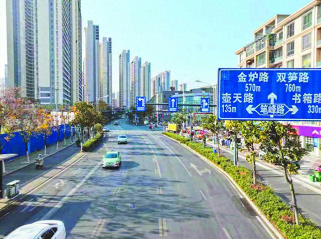 清晨7时,从石笋路向东驶入市区的车流明显增多,此时笔峰路与石笋路交口的潮汐车道开始发挥作用,沿石笋路向西行驶的一条车道,变成了向东行驶的车道,而像这样的潮汐车道,经开区全区共设有6处,有效平衡了不同时段交通流向的不均衡问题。