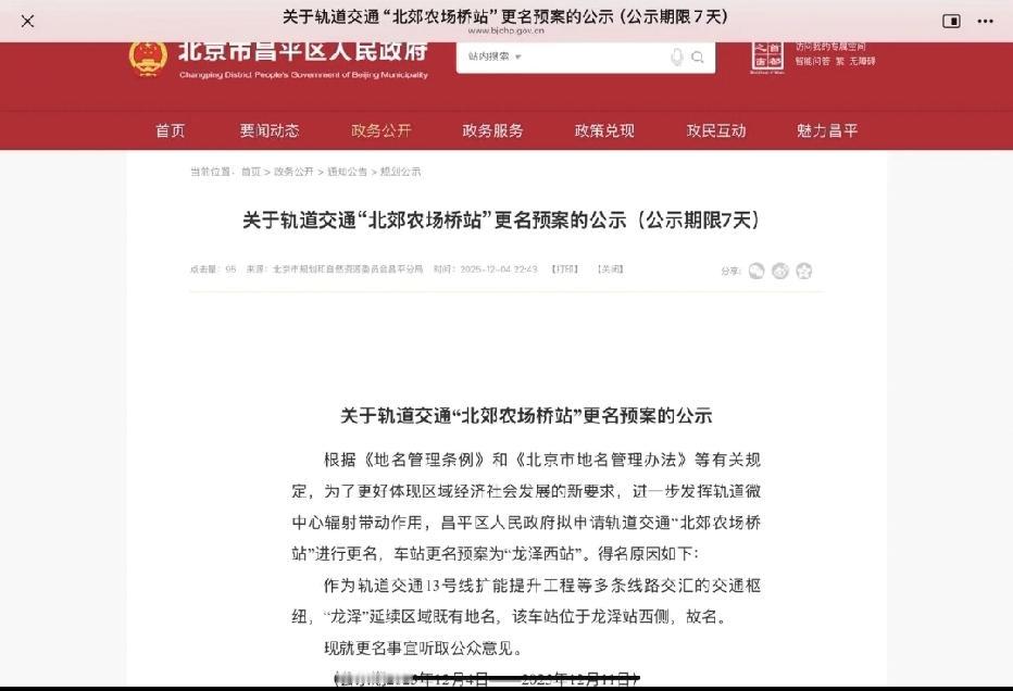 劲爆消息!北京18号线已挂牌的“北郊农场站”又要更名啦! 昨天晚上22点43分昌平区发布了一则关于轨道交通“北郊农场站”更名预案公示。 说要把“北郊农场站”更名为“龙泽西站”,是因为该站是13号线扩能提升工程,是18号线、13号线、19号线和东北环线四线交汇的枢纽,延续区域既有地名,且车站位于龙泽站西侧,故更名为“龙泽西站”! 我就纳闷了,“北郊农场”这个名字挺好的呀,承载着京北从农垦基地到城镇化枢纽的变迁,沿用旧站名并非守旧,而是让轨道交通成为“历史载体”——哪怕城市面貌迭代,也可通过地名留存集体记忆! 而且,现在北郊农场都已经挂牌了,再来更名这不是浪费人力、物力、财力吗?早干嘛去了? 新龙泽➡️龙域➡️北郊农场桥➡️龙泽西,你更喜欢哪个站名?北京地铁更名 18号线站名变更 北郊农场站