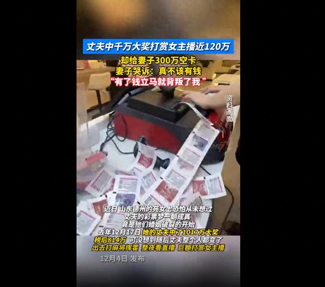 可以共苦,不能同甘?近日,一起“丈夫中千万彩票后打赏女主播120万”的纠纷,引发关注。