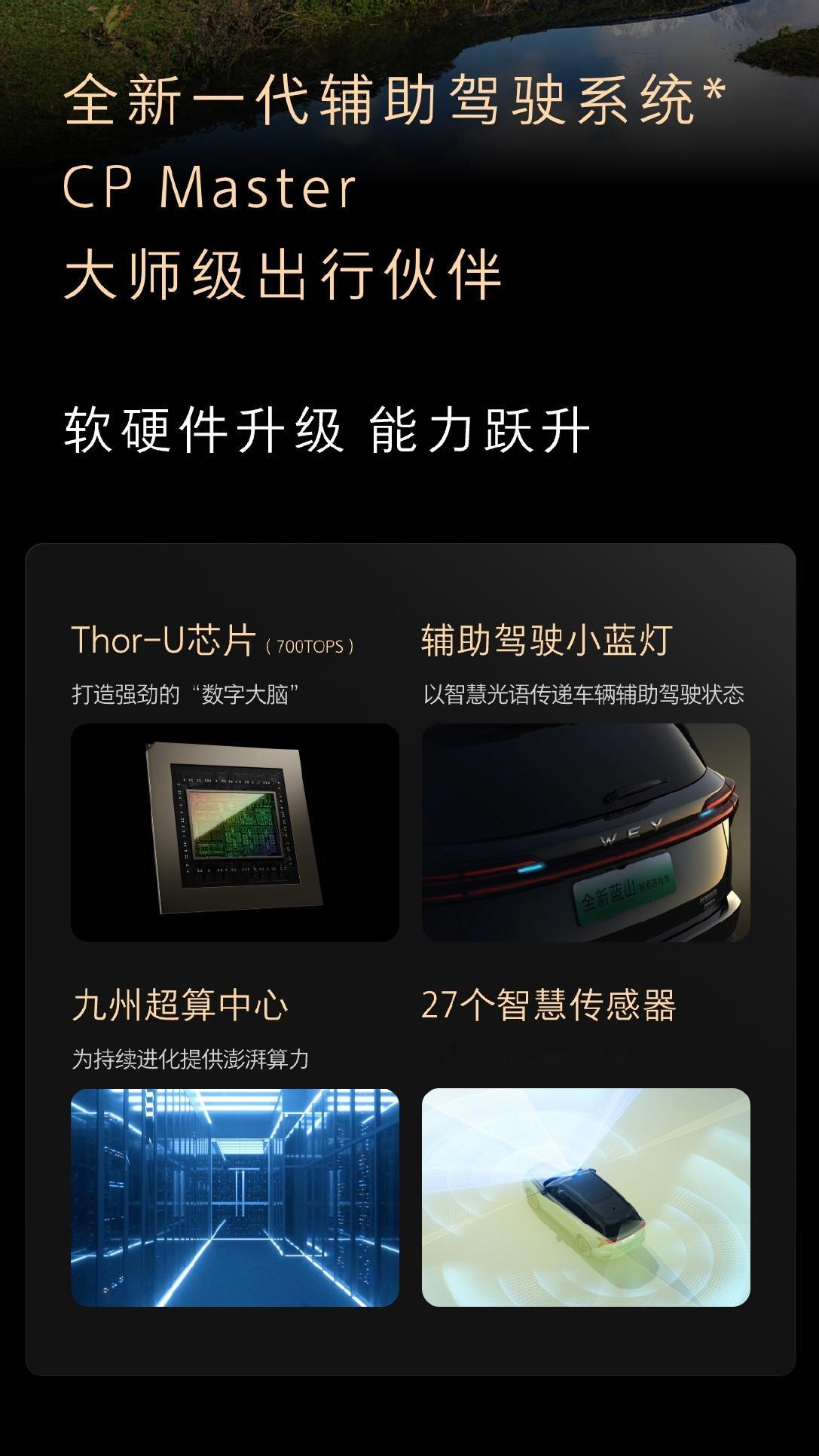 魏牌作为一个传统汽车品牌,在智驾这块走的还是挺靠前的。去年我就测过蓝山智驾版,其泊车等很多功能体验比不少新势力的产品都强。今天蓝山的智能进阶版也开启预订了,硬件升级了不少。全车配备27个智慧传感器,算力700Tops的Thor-U芯片,小蓝灯也上了。软件层面,VLA大模型大模型上车,在更多场景上有更强的处理能力。新能源汽车大V聊车